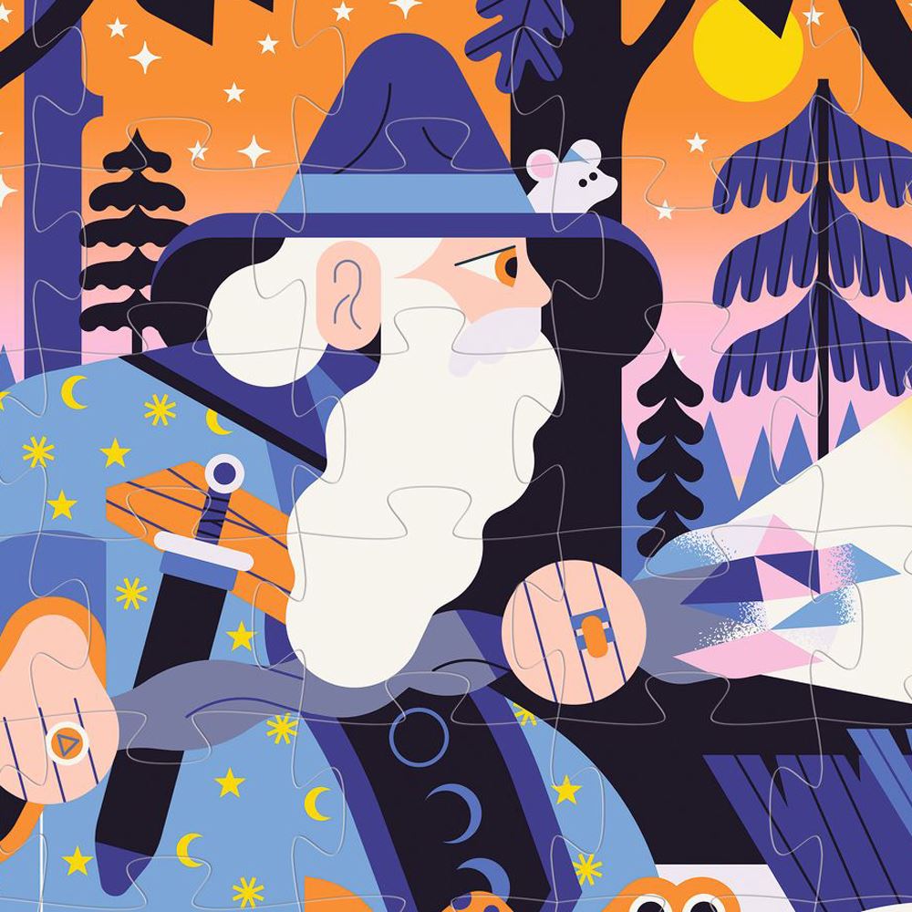 Puzzle design: Discover the magic of an enchanted forest at night with our captivating puzzle illustration. Join the wizard and his adorable companions as they stroll under the glow of his sparkling crystal scepter.