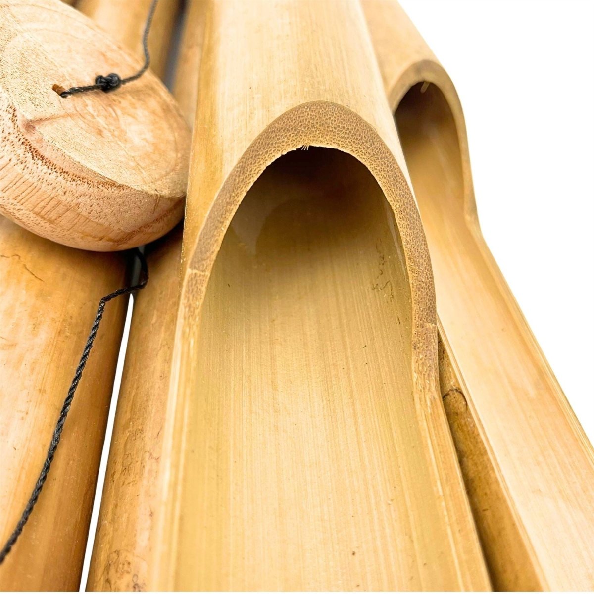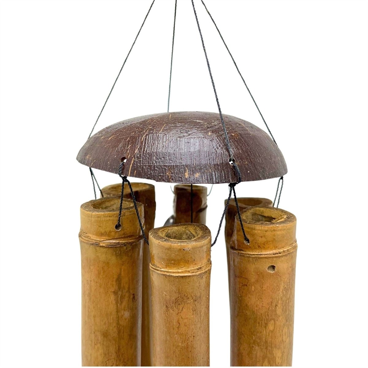 Bamboo wind chime with coconut shell top, creating a soft calming sound. Perfect for garden decor, patios or as a thoughtful gift for outdoor spaces