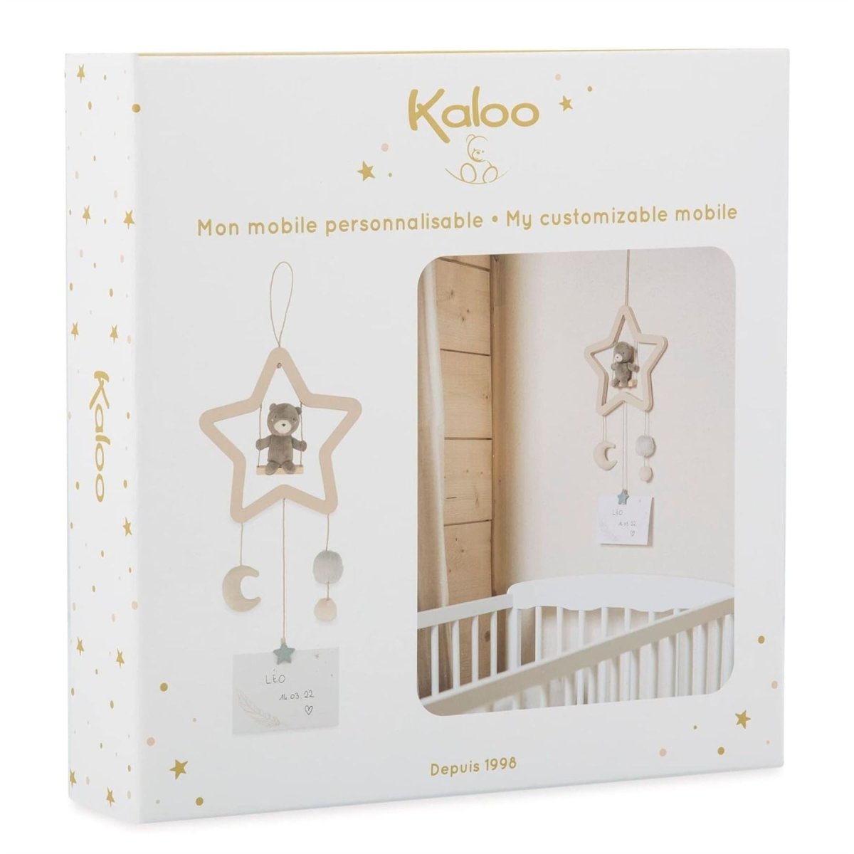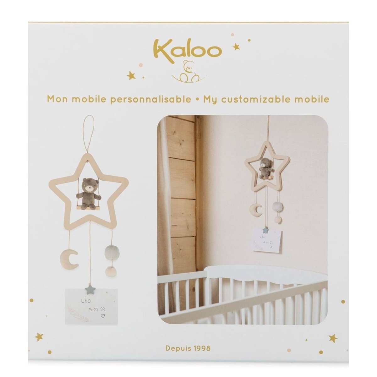 CRIB MOBILE: This Kaloo Teddy Mobil set includes 1 card, 1 wooden (MDF), and microfibre (polyester) mobile, with 100% recycled stuffing. Surface wash only for easy maintenance.