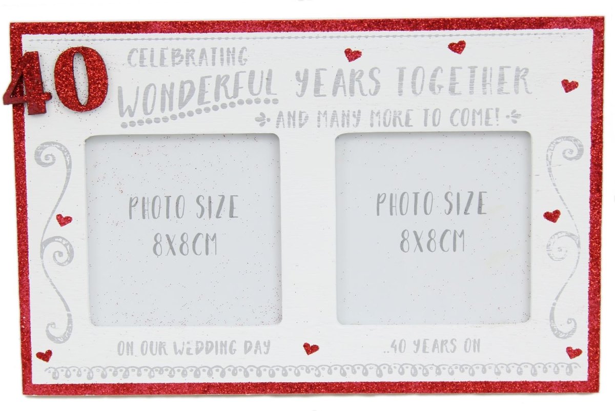 Love bears all things, believes all things, hopes all things, endures all things. Love never fails. Here you are now, celebrating 40 wonderful years together. This delightful photo frame will display two photos. One from your wedding day and one 40 years on. Still in love, still going strong. Two simple photos, but with an interwoven mosaic of your story, unspoken, of the years in between. Really lovely. There is glitter aplenty. It makes a super gift idea for a special couple. Dig out some photos, place them in and hand over as a thoughtful gift. It will bring memoreies flooding back. Freestanding only.
