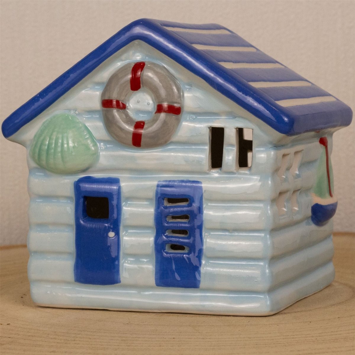 BEACH HUT ORNAMENT | Embrace the tranquillity of the sea with our LED Ceramic Blue Beach Hut. Adorned with a life ring and seashells, this nautical beach hut ornament brings a coastal vibe to any space, making it an ideal choice for enhancing your home decor with a touch of seaside charm