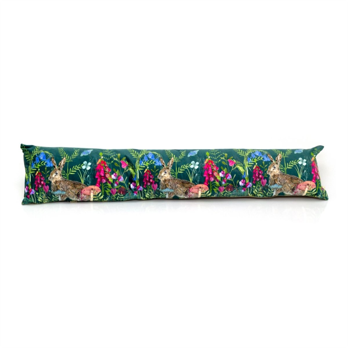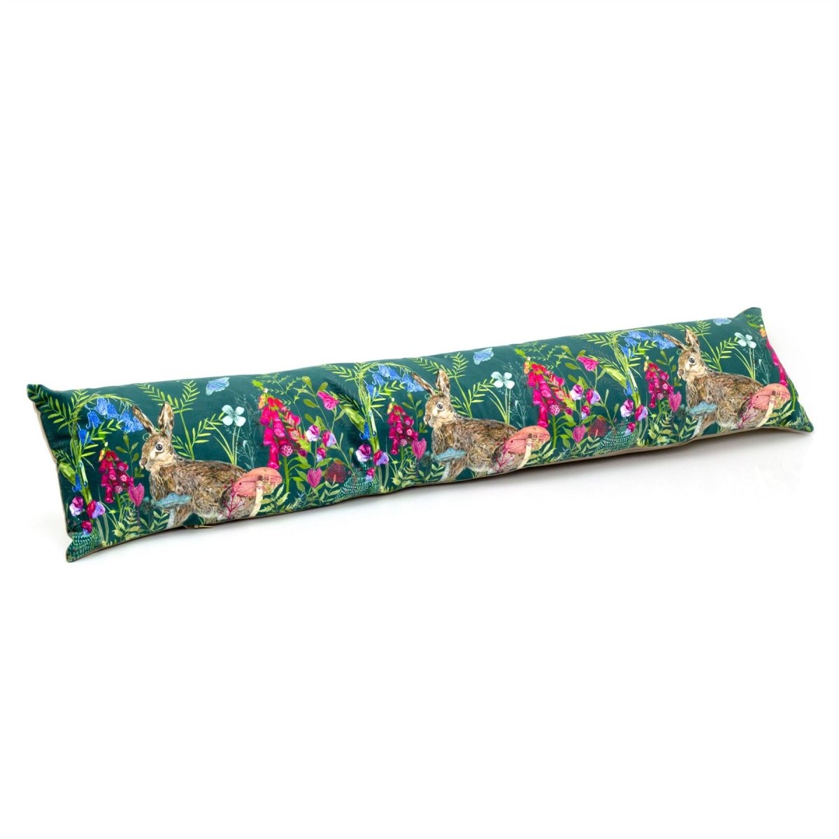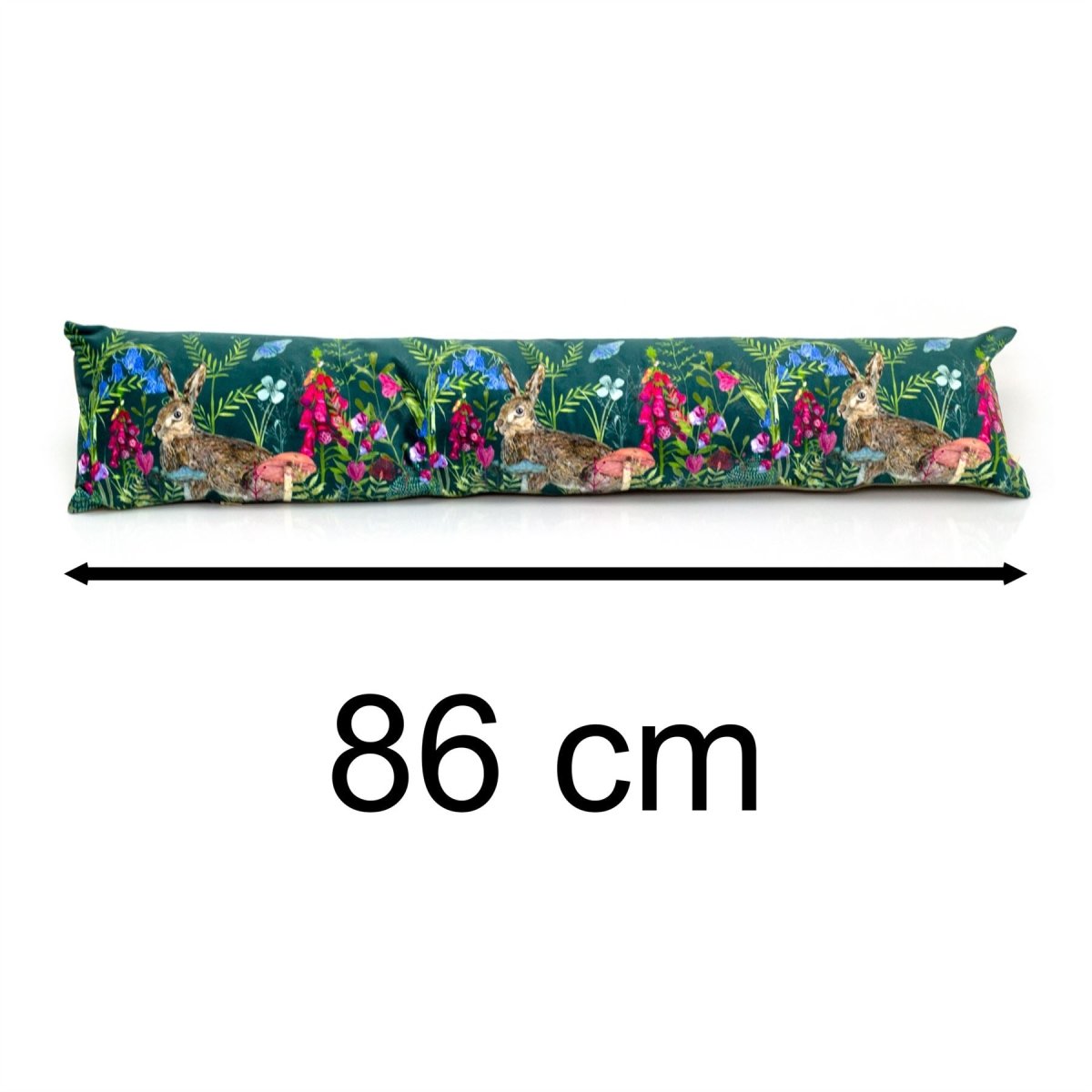 DRAUGHT EXCLUDER | Turn your garden into a cosy haven with our Willow Hare draught excluder. Three curious hares amid vibrant flowers and a contrasting background form a captivating scene that adds character to any room