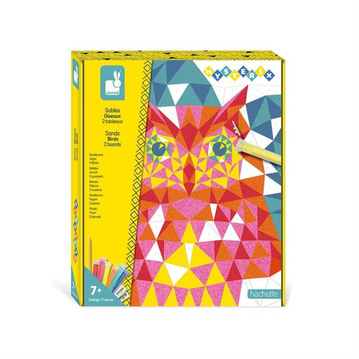 ENGAGING CRAFT ACTIVITY: The Janod Birds Sand Art Box Set provides a captivating craft activity for children aged seven and up. This art kit includes two bird themed pictures - a parrot and an owl - designed to develop precision and concentration as children carefully deposit coloured sand in the correct areas.