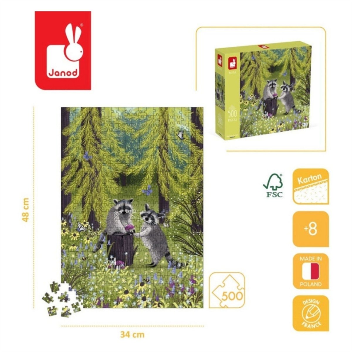 Immerse yourself in the beauty of nature with this 500-piece cardboard puzzle, designed for experienced puzzle enthusiasts and fans of classic brainteasers. Witness an extraordinary scene featuring two sweet raccoons in a dense, flowered forest. This nature-themed puzzle is rich in detail and vibrant colours, providing a delightful and engaging activity for children aged 8 and up, as well as adults. Designed to enhance patience, concentration, dexterity, and logic, this puzzle offers a perfect blend of fun and education. Whether you choose to tackle it alone or with others, it provides a moment of relaxation and an excellent opportunity to develop problem-solving skills. The puzzle's portrait format measures 48 cm x 34 cm, making it ideal for display once completed.