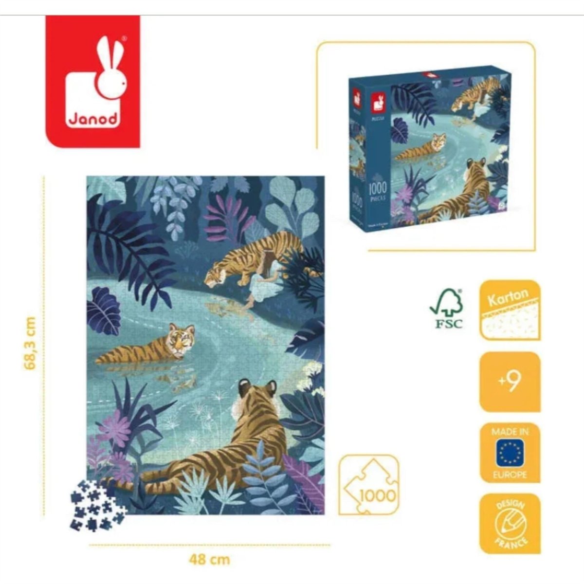 Immerse yourself in a serene puzzle experience with Janod's 1000-piece Tigers in the Moonlight Puzzle, suitable for adults, teenagers, and children aged 9 and above. Featuring a peaceful scene with a woman and three tigers in a lush jungle, this puzzle enhances visual skills, dexterity, and logical thinking. Part of Janod's artistic collection, it showcases intricate illustrations by talented artists. Crafted in Europe from FSC-certified materials, this high-quality puzzle measures 68 cm x 48 cm, providing an engaging and eco-friendly activity. Enjoy a tranquil and fulfilling puzzle time with this beautifully illustrated piece, perfect for solo or group enjoyment.