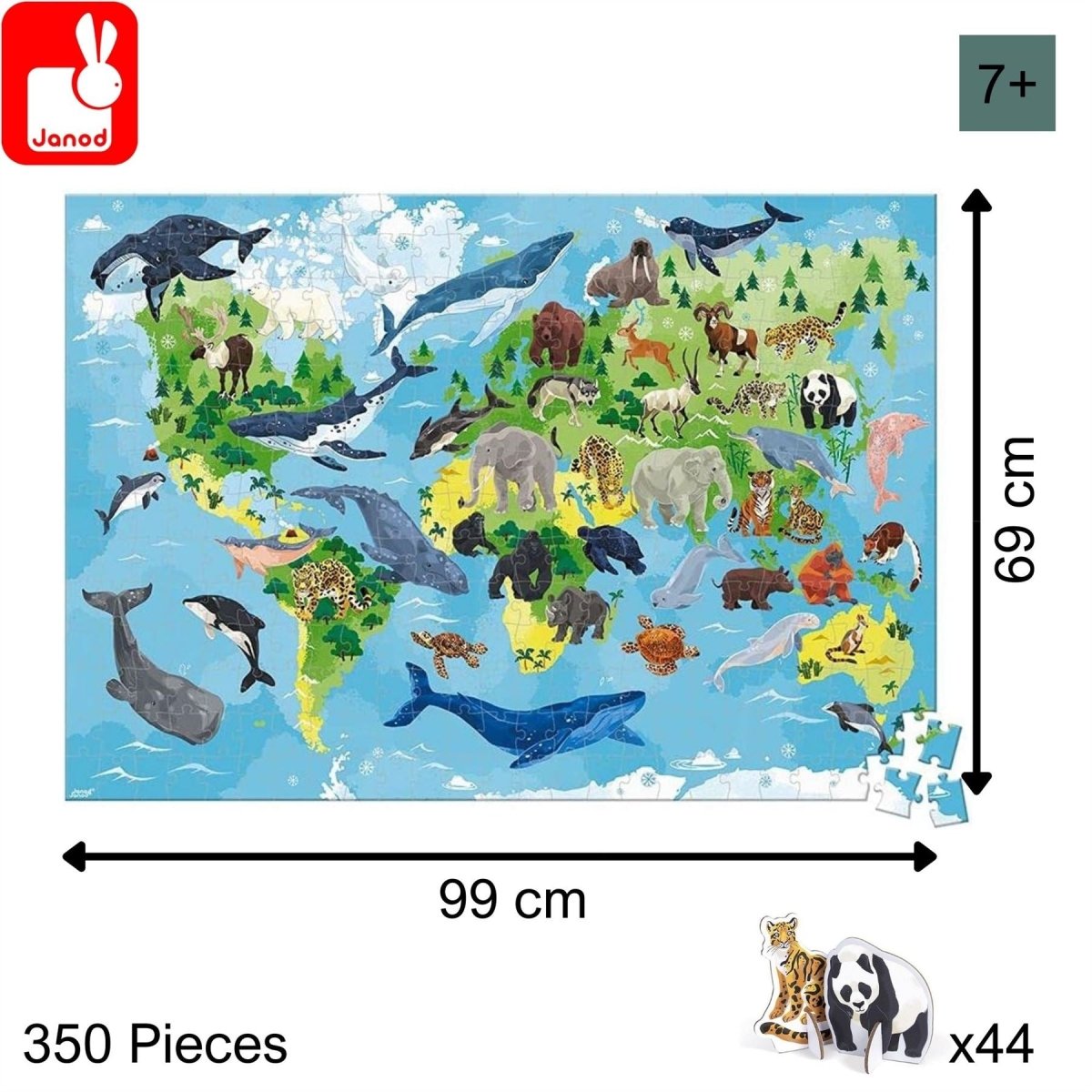 The WWF educational puzzle by Janod features 350 cardboard pieces showcasing 44 endangered species, perfect for children aged 7 and above. Each animal figure is named on the back, enhancing wildlife learning during puzzle assembly. Includes a world map poster and educational booklet, fostering understanding of biodiversity and conservation efforts. Made from FSC certified cardboard and water based paint, this puzzle supports WWF's environmental initiatives. With dimensions of 99 cm x 69 cm x 0.3 cm, it offers an engaging and educational activity promoting ecological awareness and conservation ethics.