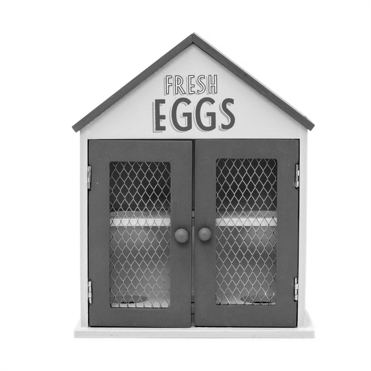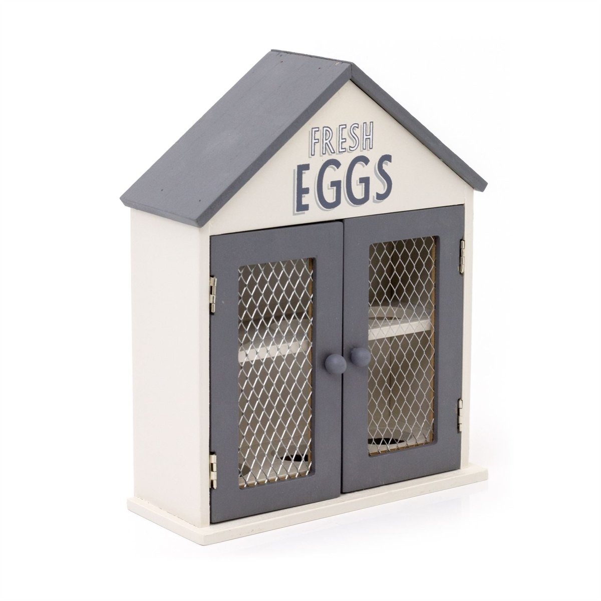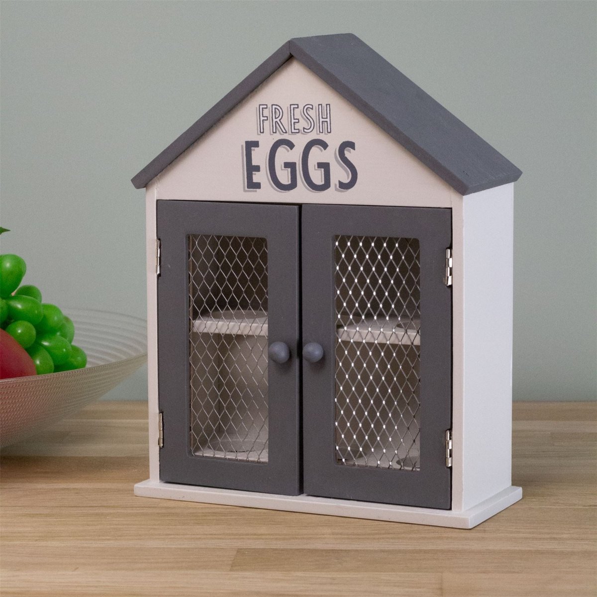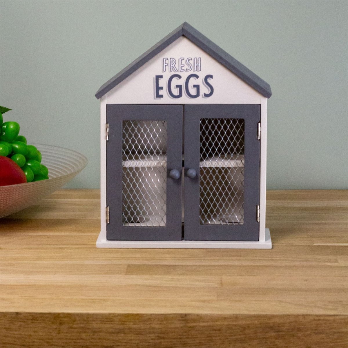 EGG HOUSE | Elevate the aesthetics of your kitchen while keeping your eggs organised with this unique and eye-catching egg house. Featuring a white wooden exterior with a grey roof, doors and adorned with the inscription "fresh eggs," this egg house is as stylish as it is functional