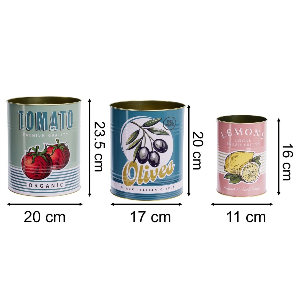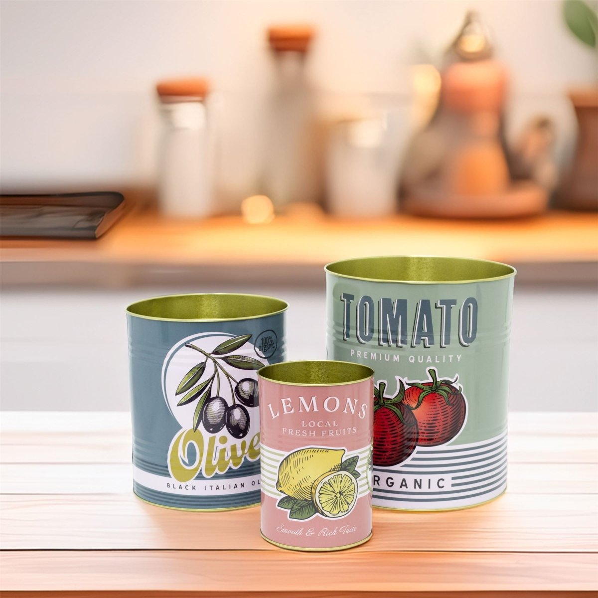 RETRO CHARM | Set of 3 decorative tins styled like vintage food cans - tomato, olive and lemon - with bold retro labels