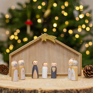 7-Piece Wooden Christmas Nativity Scene with Mini Peg Figures & Stable - 23.5cm