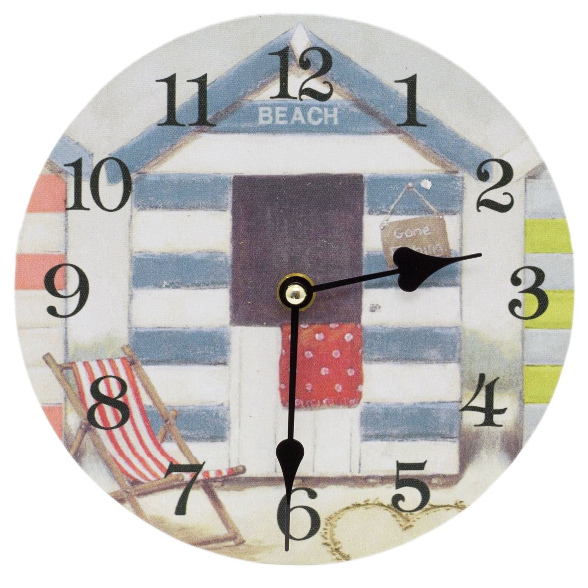 SILENT CLOCK: A fun clock for home, pool house or beach hut. The clock is produced in wood with a canvas print face complete with a quintessential beach hut, sure to make you think of the seaside every time you look at it