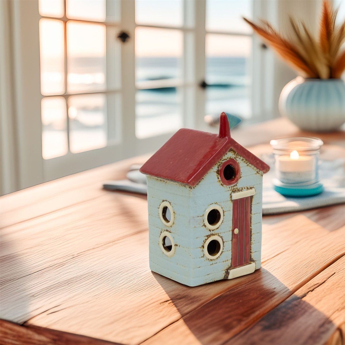 NAUTICAL TEALIGHT HOLDER | Ceramic beach house-shaped tealight holder that brings a playful coastal vibe to any room