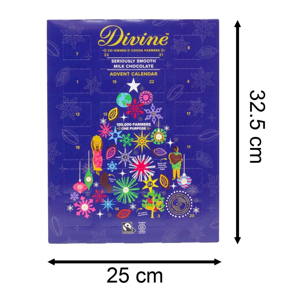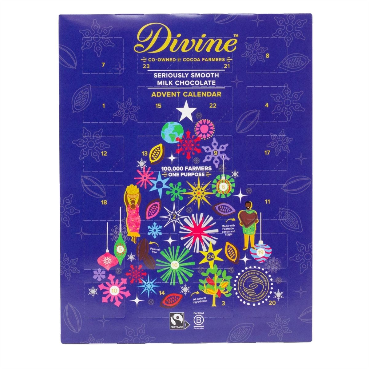 Savour this Divine Chocolate advent calendar. Each day reveals a delicious treat made with 100% pure cocoa butter and rich Fairtrade cocoa, perfect for a festive countdown or gift
