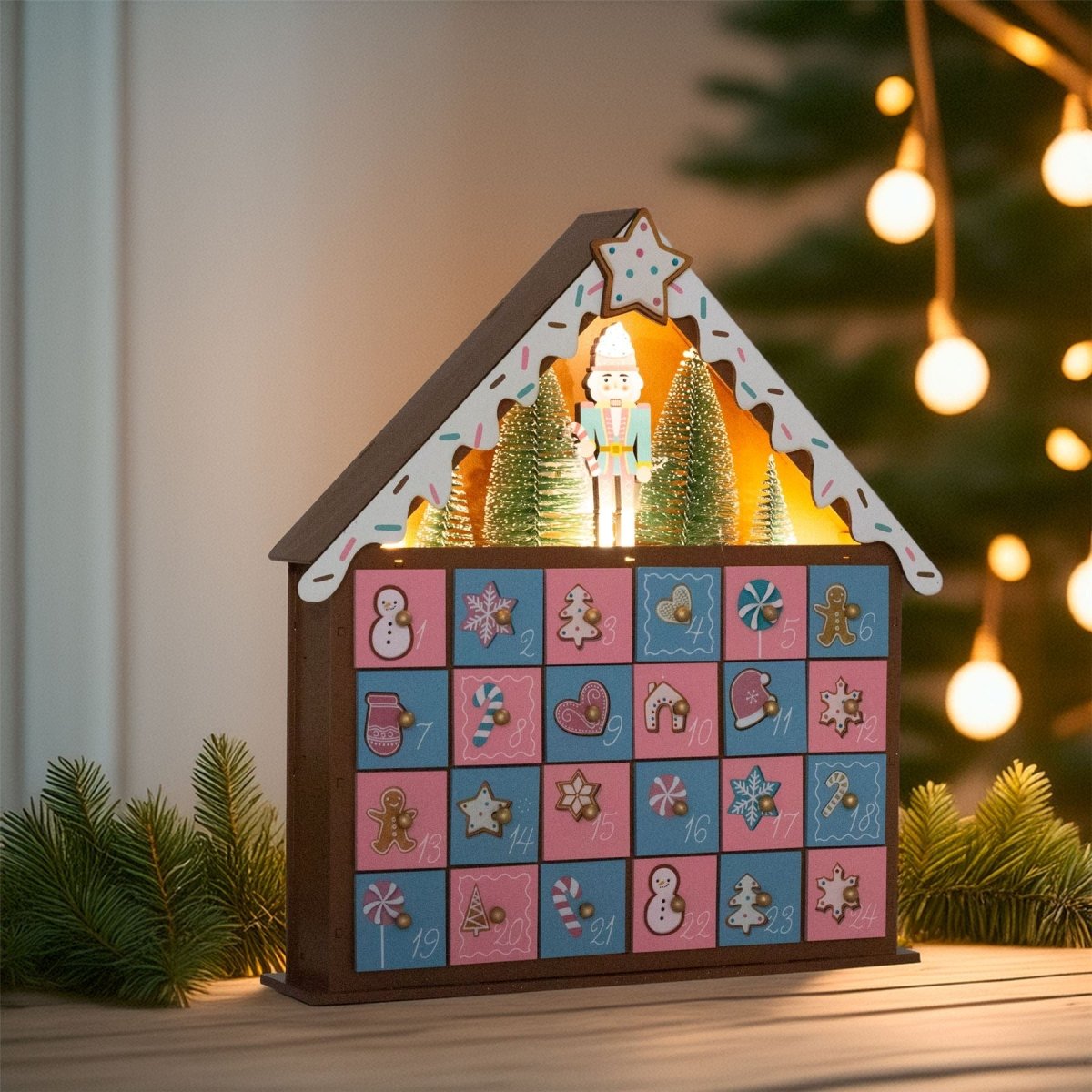 Add a sprinkle of sweetness and sparkle to your Christmas countdown with this charming LED wooden advent calendar. With nutcracker soldier, candy motifs, and glowing festive lights, it’s a true seasonal treasure
