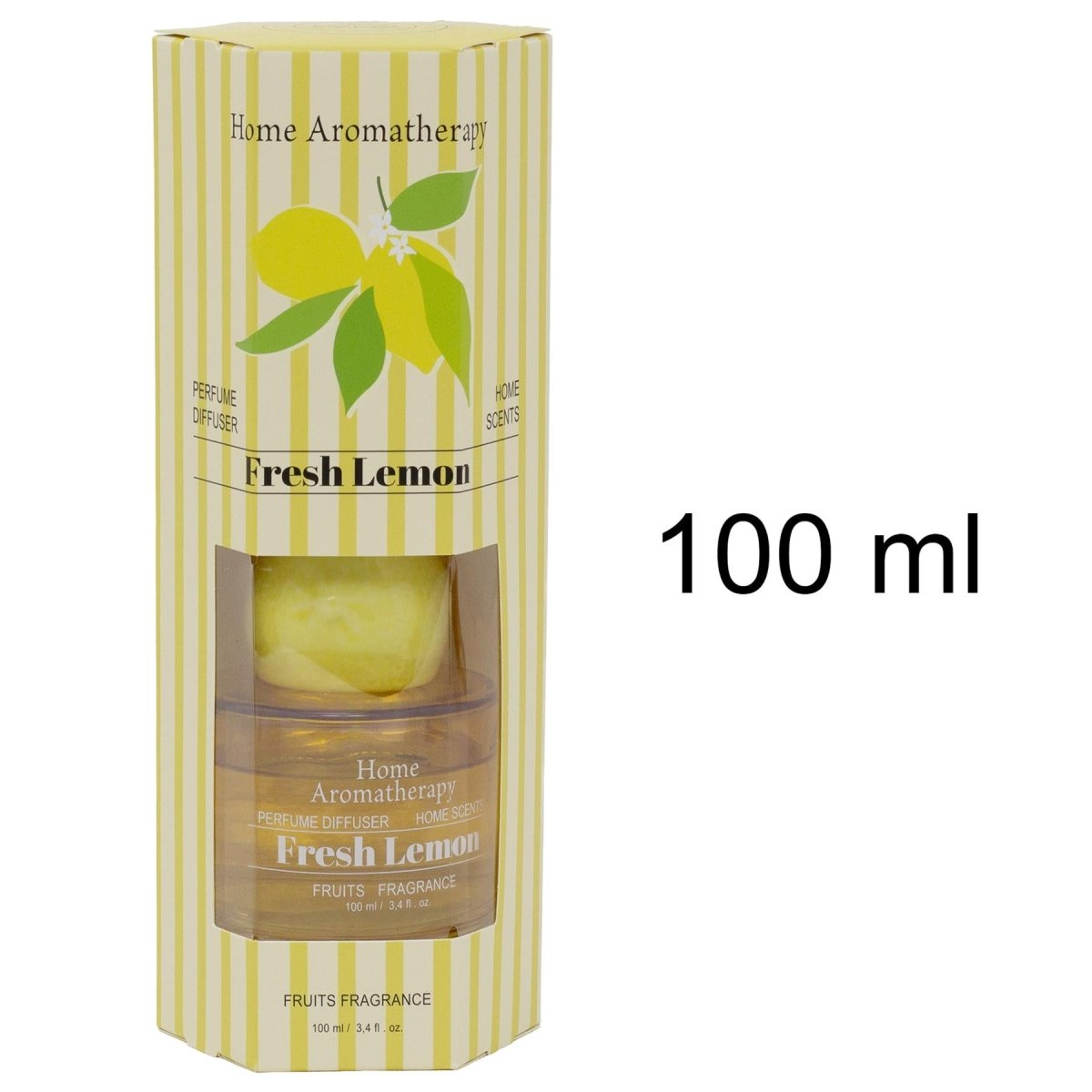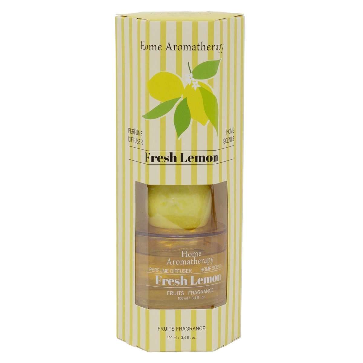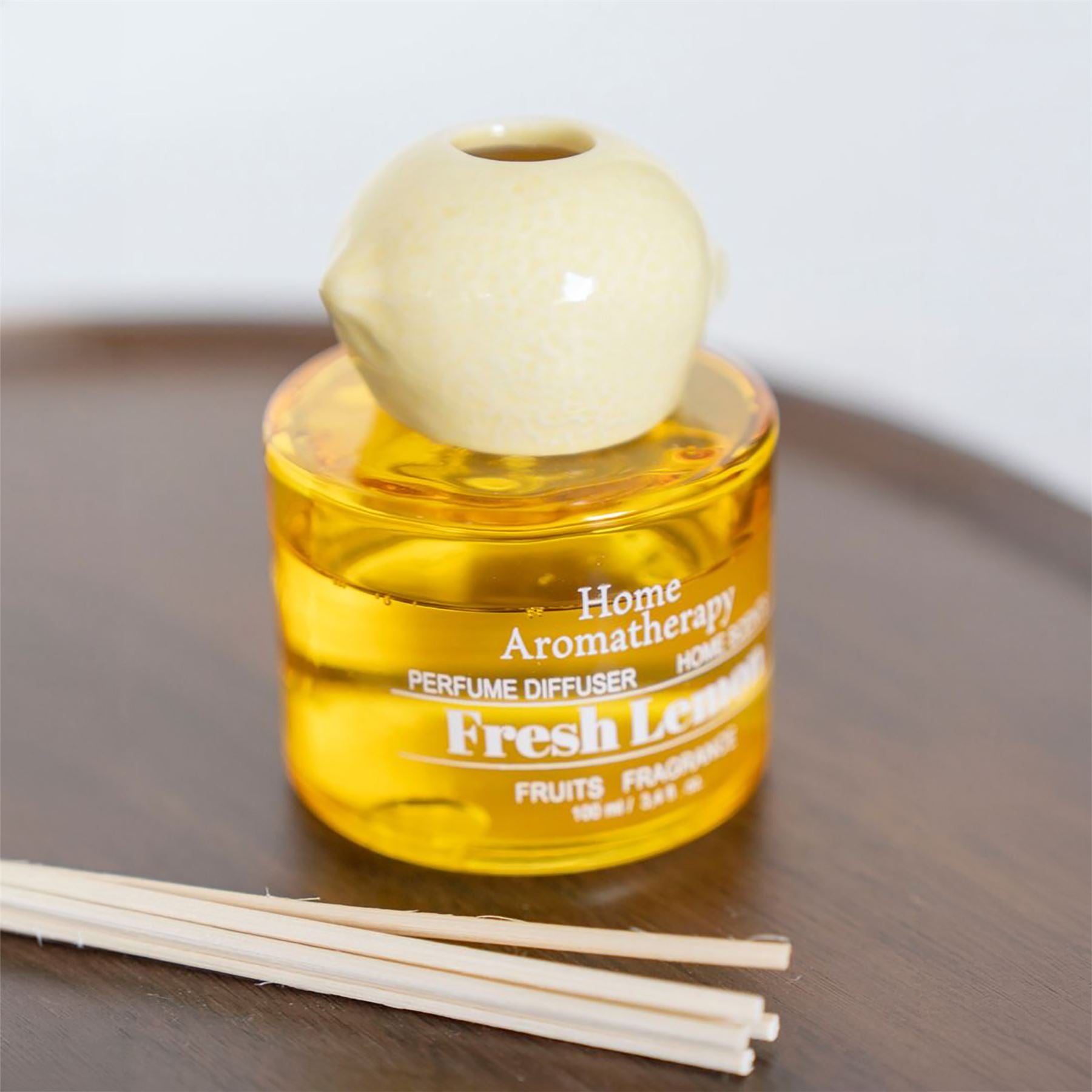 A fresh lemon reed diffuser in a yellow glass bottle with a ceramic lemon topper, offering a clean and uplifting scent for everyday living spaces