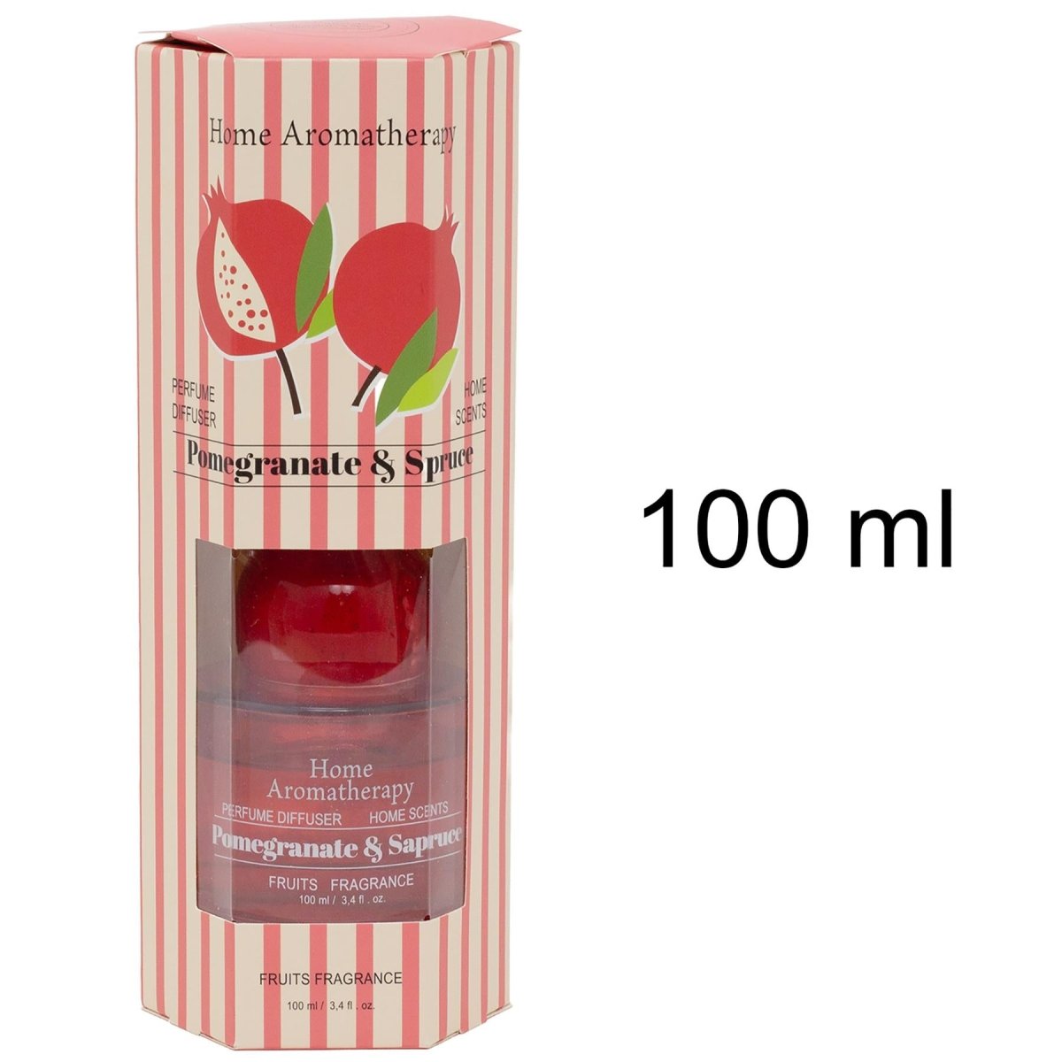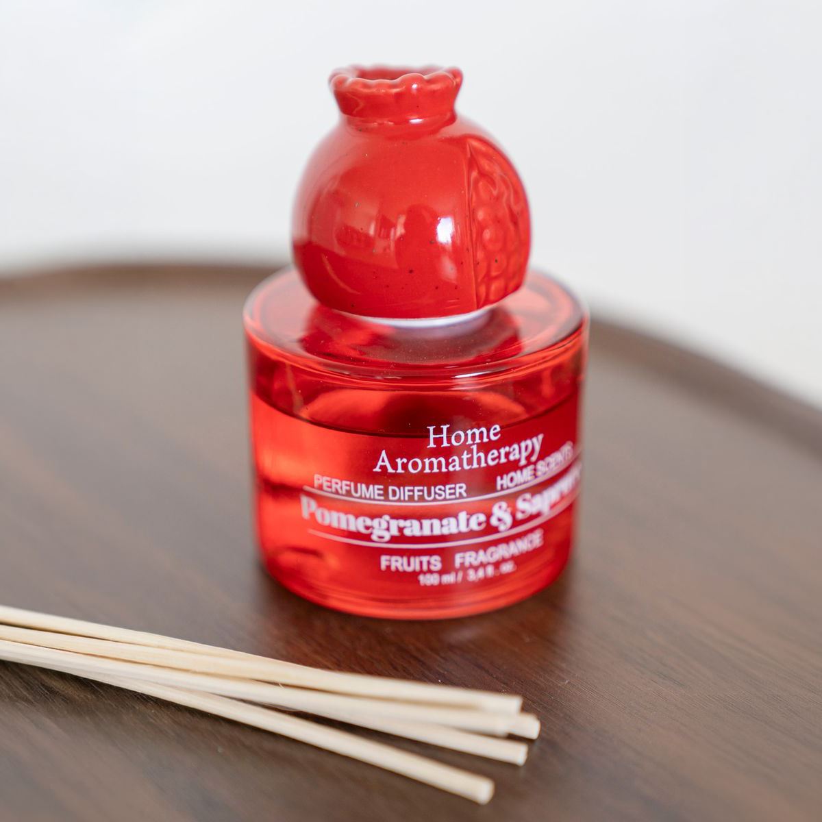 HOME FRAGRANCE | Presented in a red glass bottle with a ceramic pomegranate topper and natural reeds, offering both scent and decorative appeal