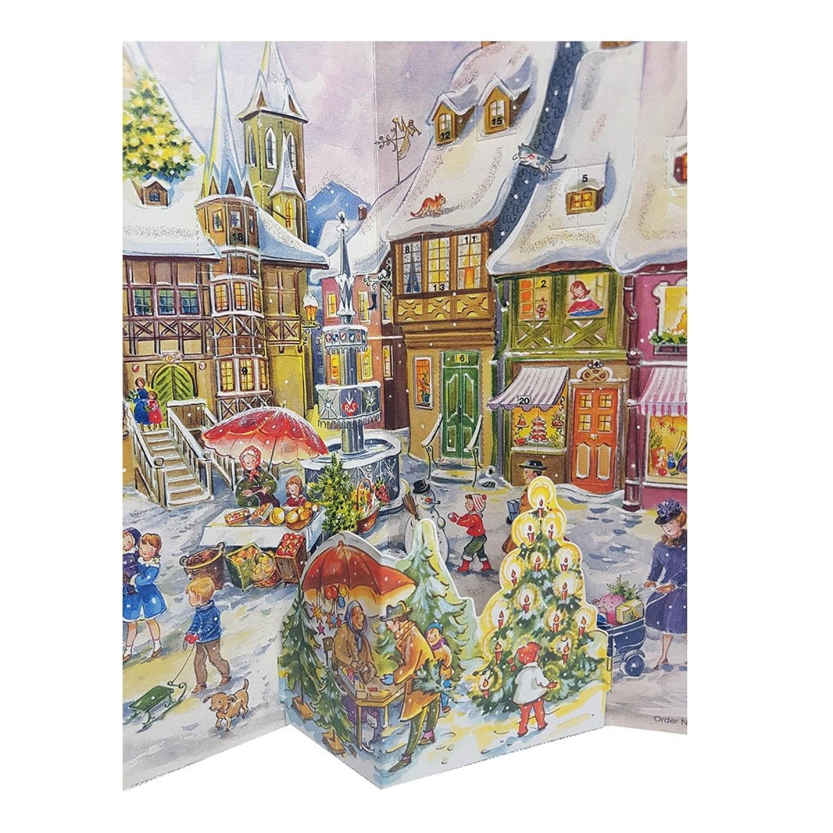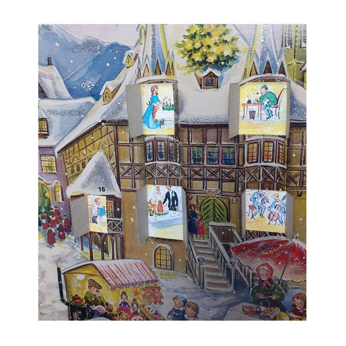 A nostalgic Christmas Advent Calendar with an enchanting village scene. Glittering, foldable Christmas village scene, ideal for all ages, delivering nostalgic charm to homes.