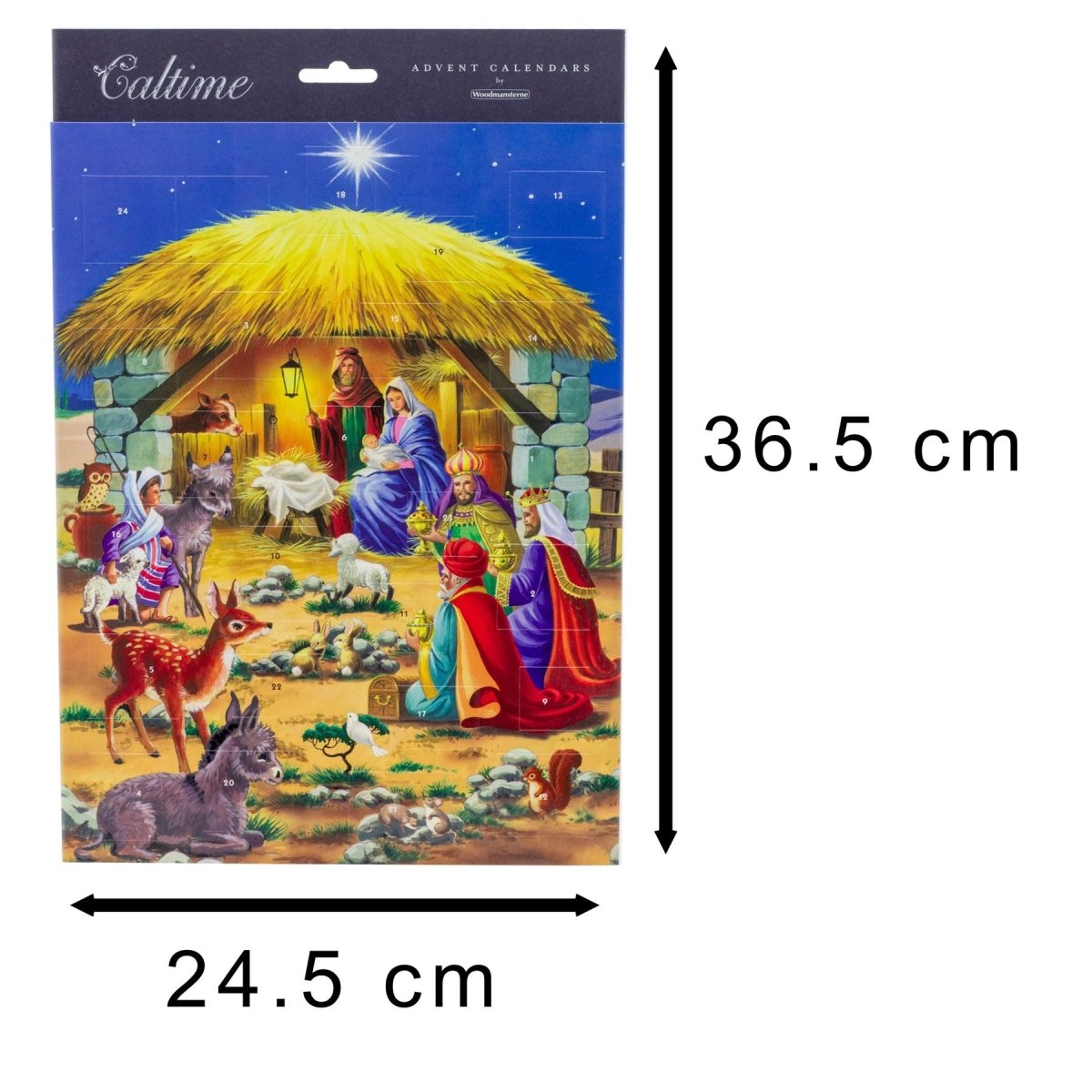 This truly wonderful Advent calendar with 24 doors, is decorated with a beautiful traditional nativity illustration