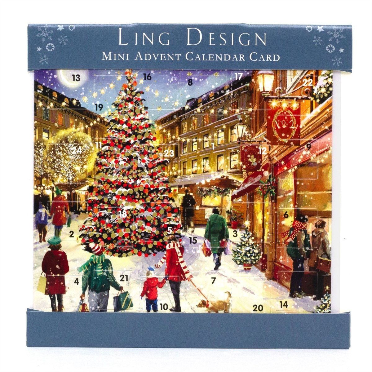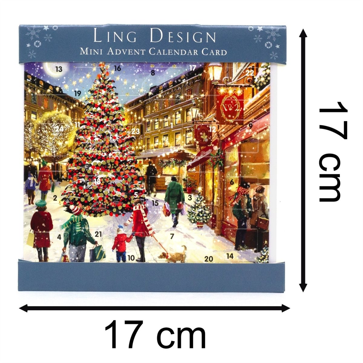 CHRISTMAS ADVENT CALENDAR | Celebrate the joy of Advent with the Christmas Eve Advent Calendar Greetings Card, featuring a beautiful, festive winter town filled with a snowy Christmas tree, cheerful shoppers, and cosy lights