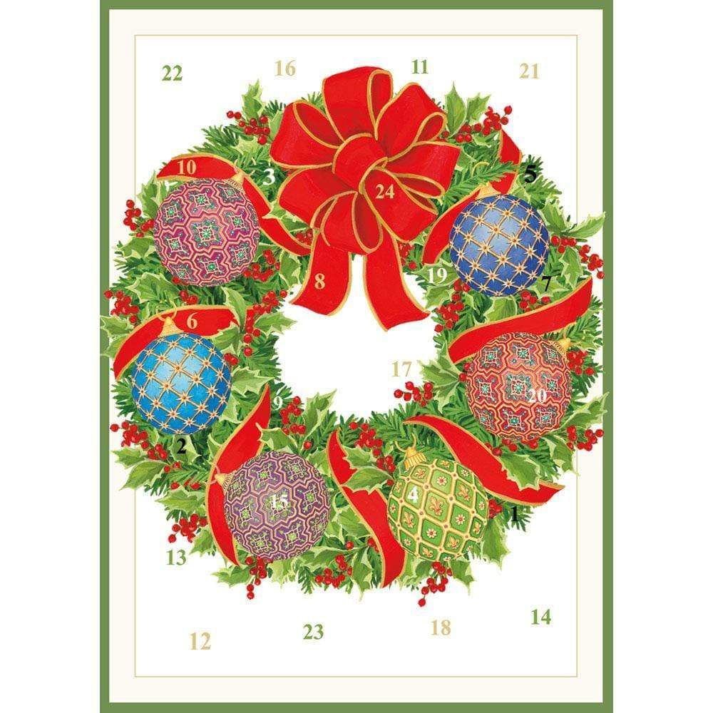 ORNAMENT WREATH ADVENT CARD | A festive twist on the classic Christmas card, this elegant advent card features a wreath of detailed baubles, holly and a bold red bow