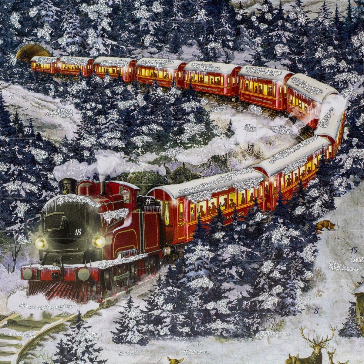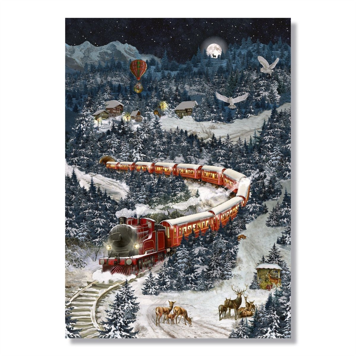 CHRISTMAS ADVENT CALENDAR | Board the magical Christmas Express with Santa Claus as he traverses a snow-covered alpine landscape. Join him on his journey as he guides the Christmas Express through a picturesque snowy village, spreading joy and cheer with every stop