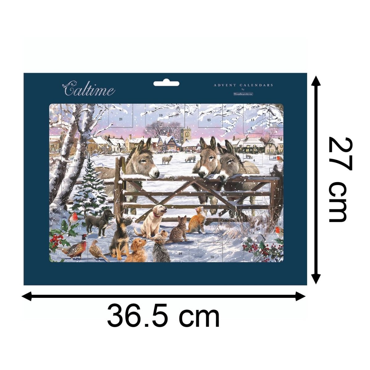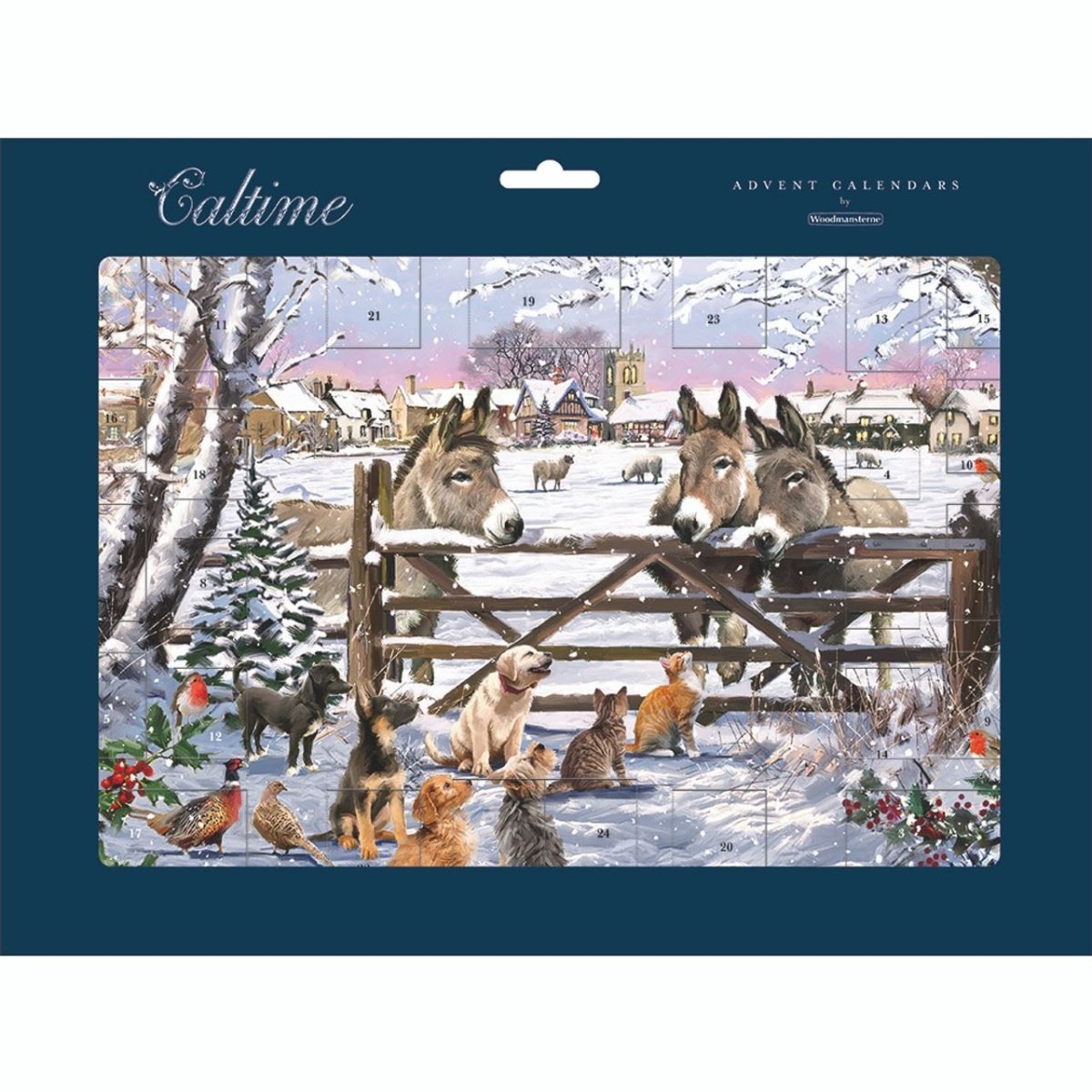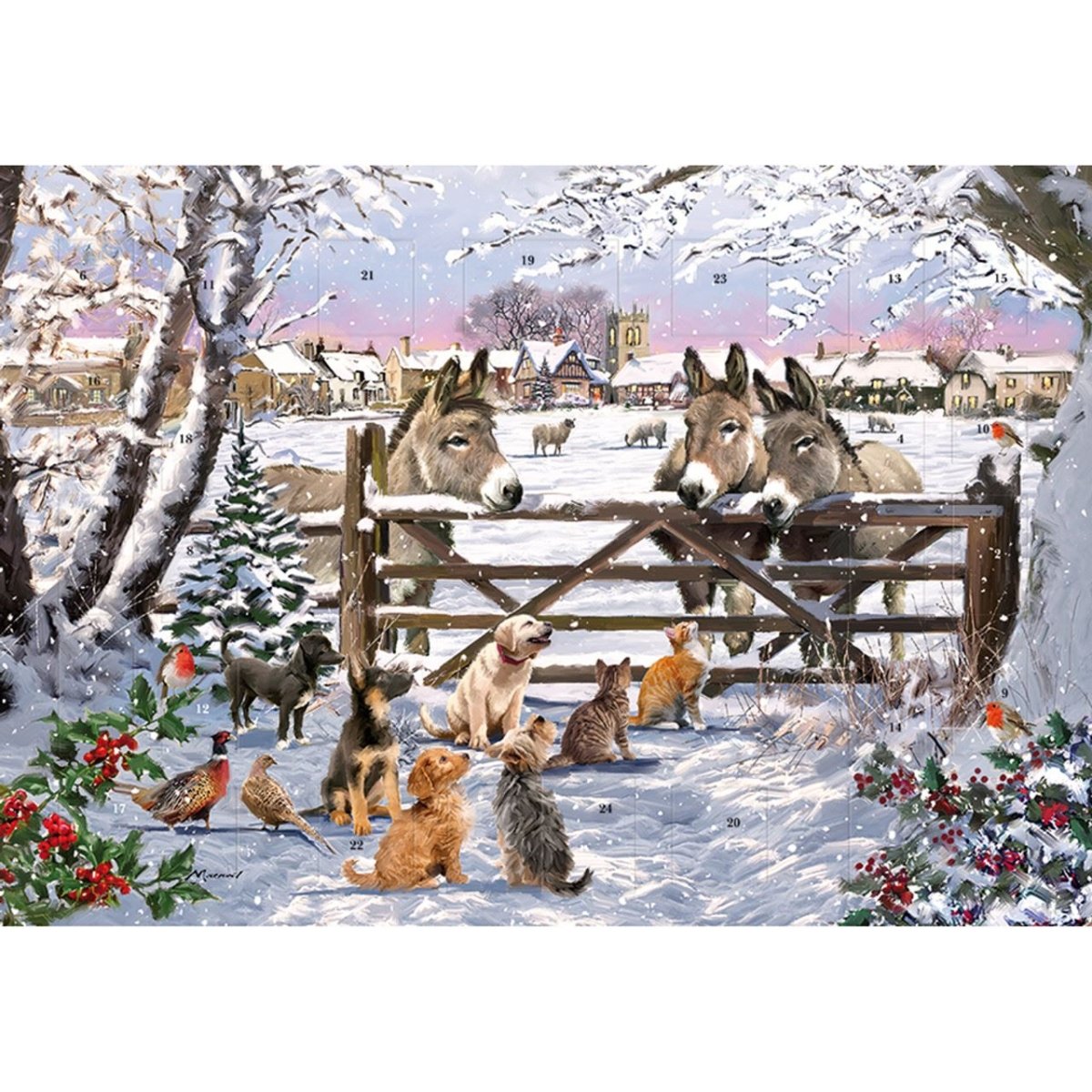 Celebrate the countdown to Christmas with this charming Picture Perfect advent calendar, featuring donkeys, cats, dogs, and other country animals in a snowy village scene
