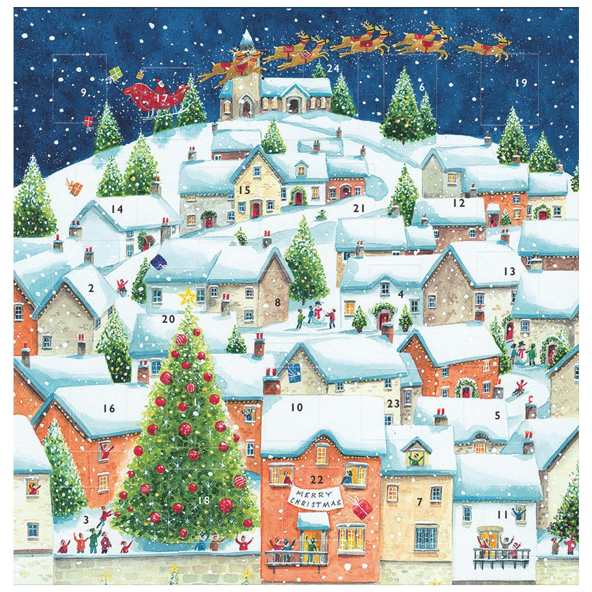 ADVENT CALENDAR | A charming picture advent calendar featuring a snow-covered village, a large Christmas tree, and Santa’s sleigh flying overhead with 24 doors to open