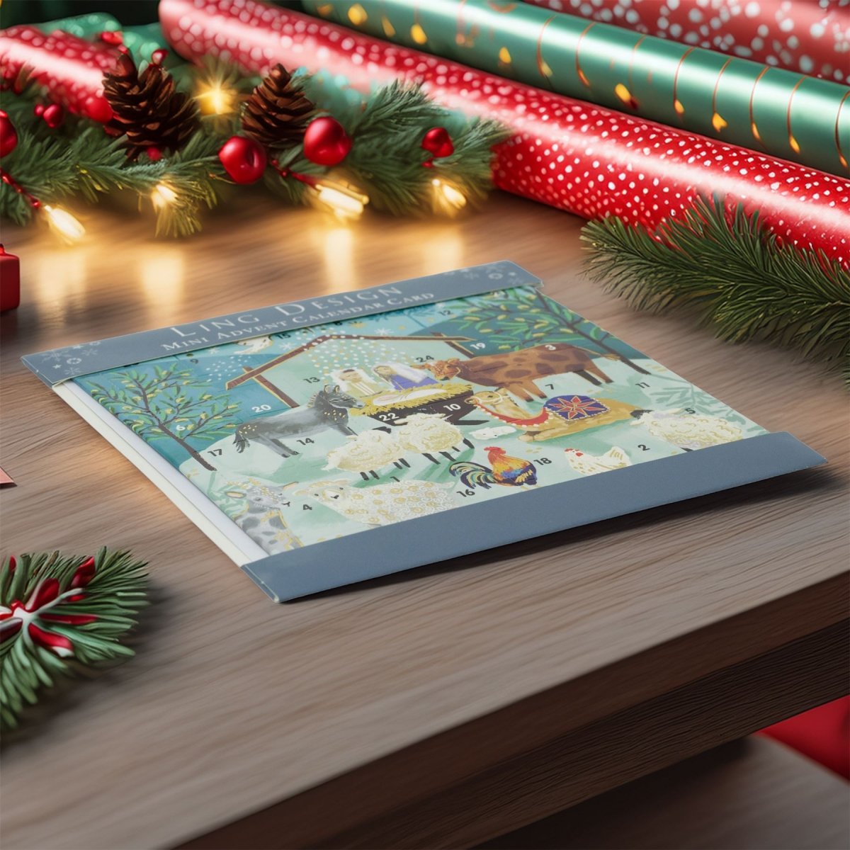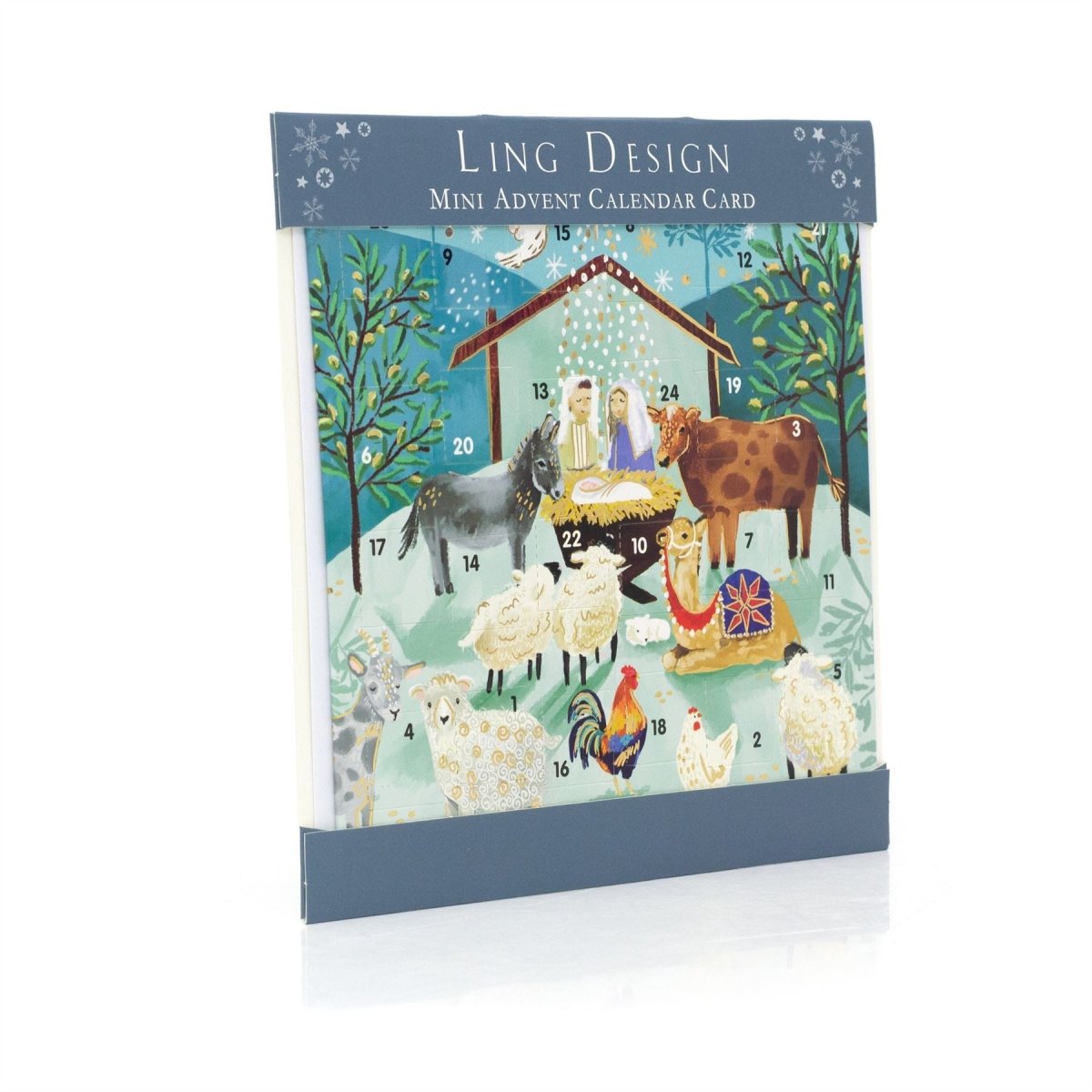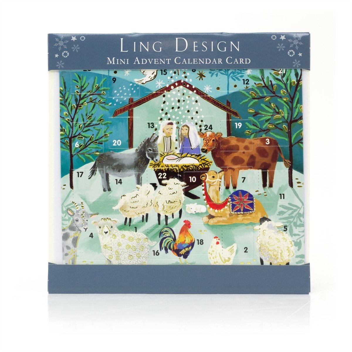 A meaningful nativity advent greetings card with 24 windows, featuring Mary, Joseph, Baby Jesus and animals, making the countdown to Christmas extra special