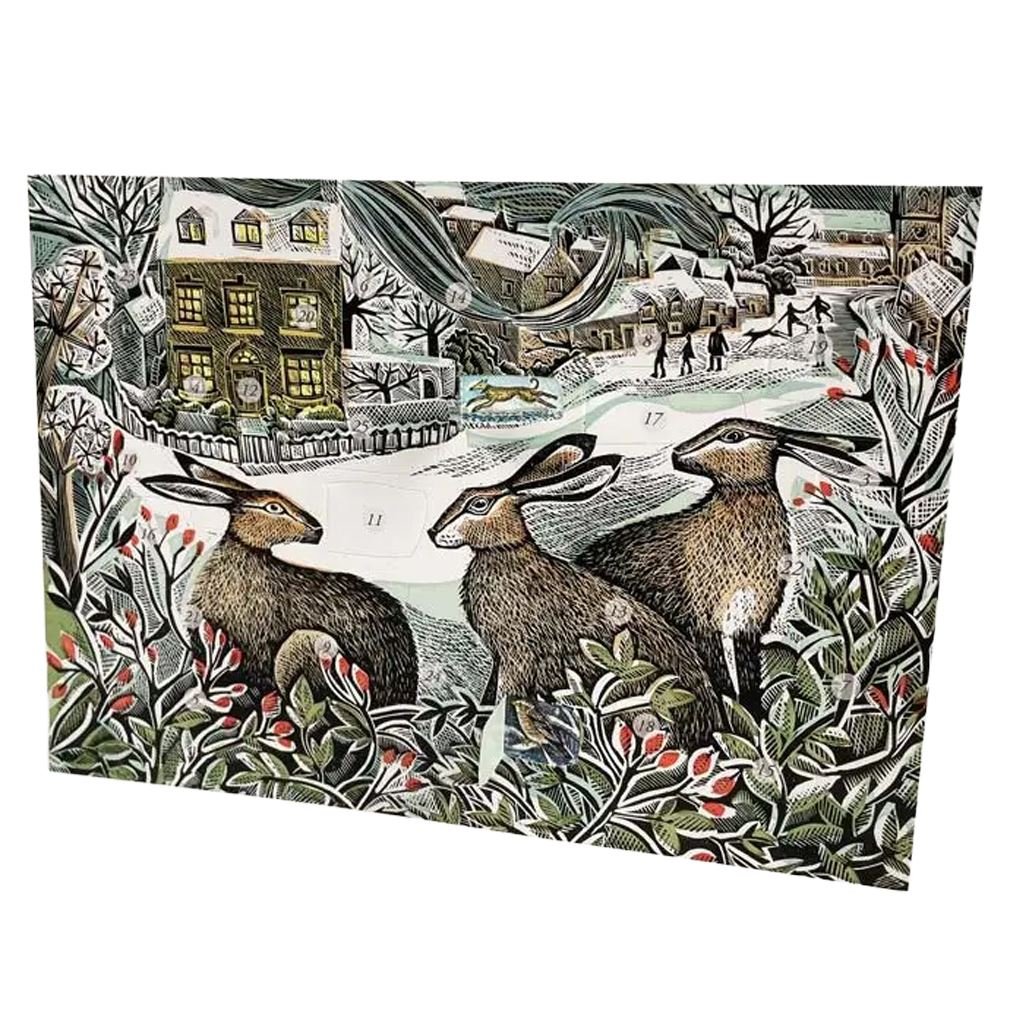 ENCHANTING WINTER ILLUSTRATION | A beautiful advent calendar card featuring three playful hares under a moonlit snowy scene, adding magic to your festive season