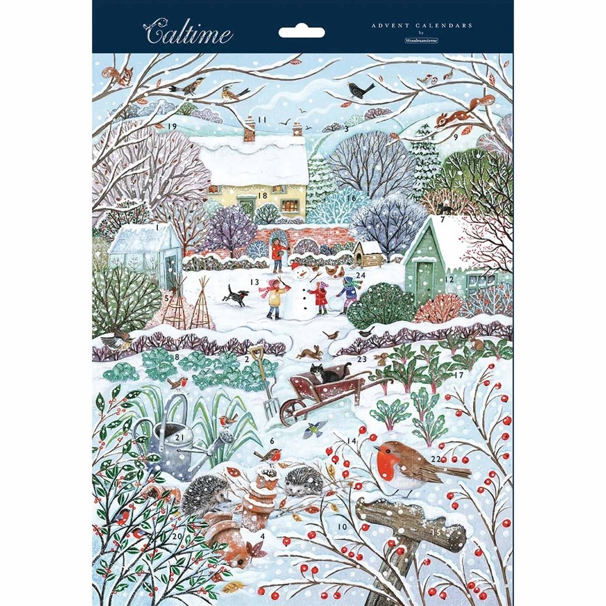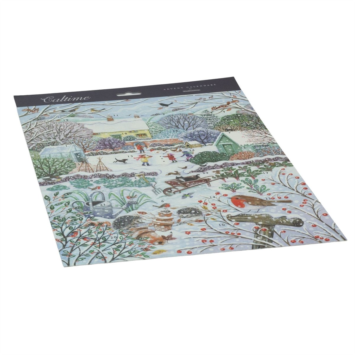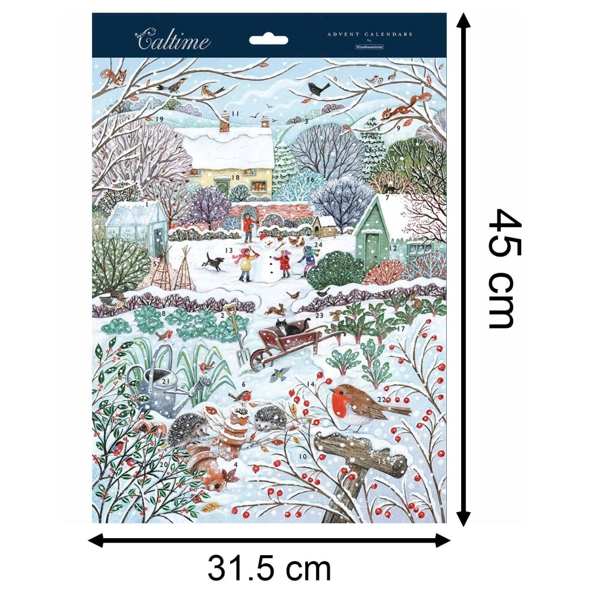 Countdown to Christmas with this enchanting Winter Garden advent calendar, featuring a snowy cottage, playful children, and woodland animals in a busy winter garden