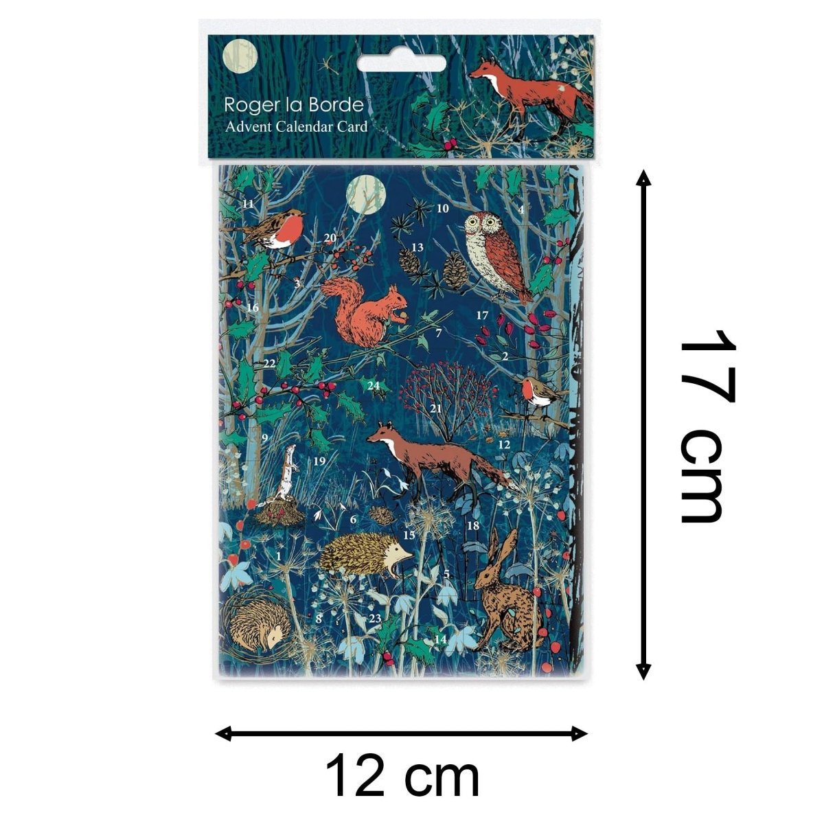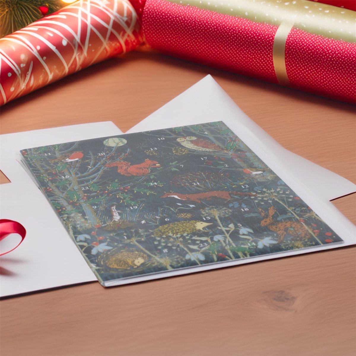 ADVENT GREETINGS CARD | A charming advent calendar greetings card featuring woodland animals under the winter moon, with numbered doors to open each day