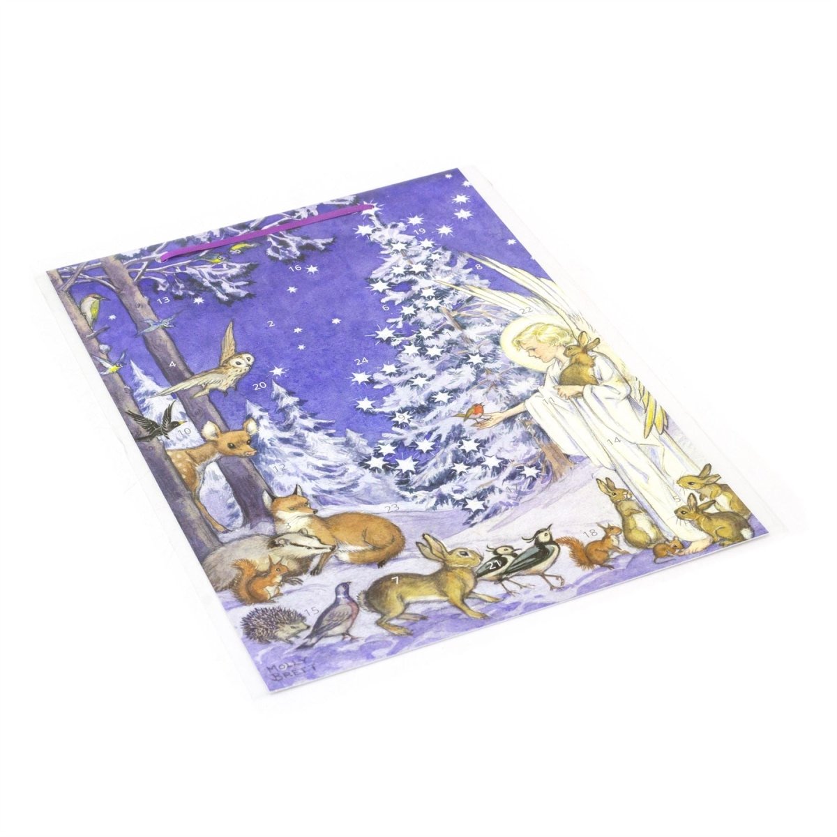 ADVENT CALENDAR | A traditional paper advent calendar featuring a snowy woodland scene, with an angel, festive animals, and a glowing star-covered tree