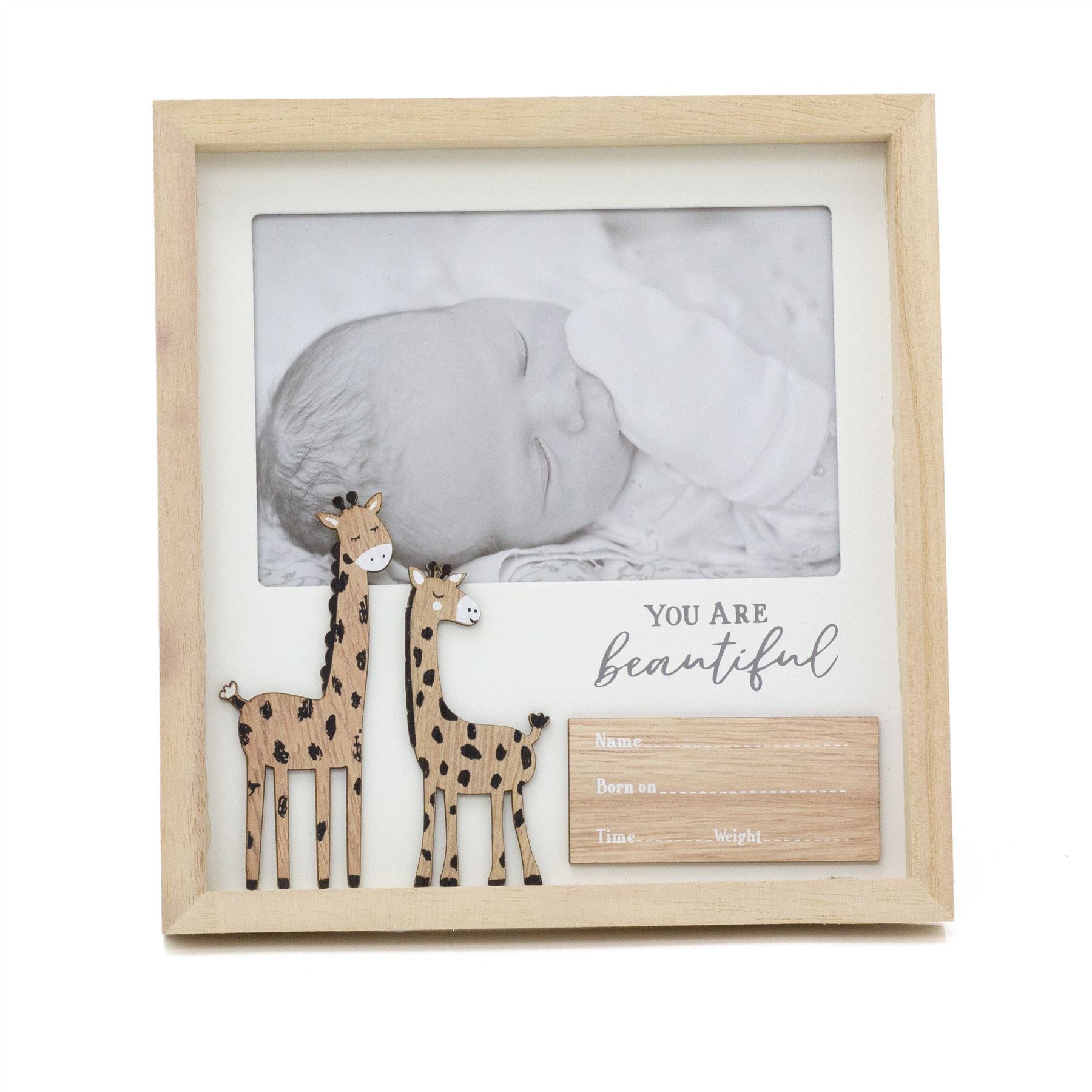 NEW BABY PICTURE FRAME | The frame has a natural wood surround decorated with cute baby giraffe characters. Ideal for a baby's nursery, especially if there is a safari theme running already
