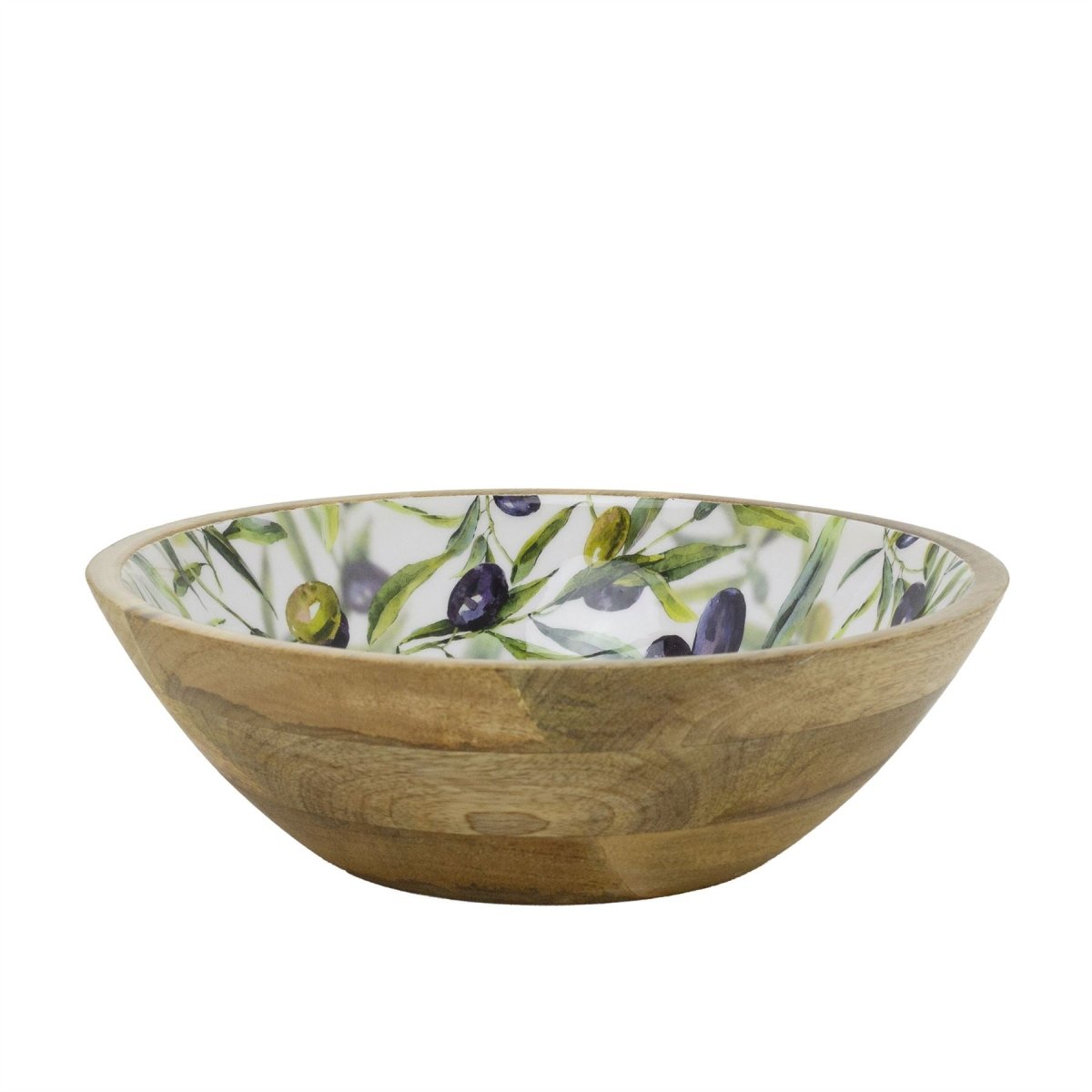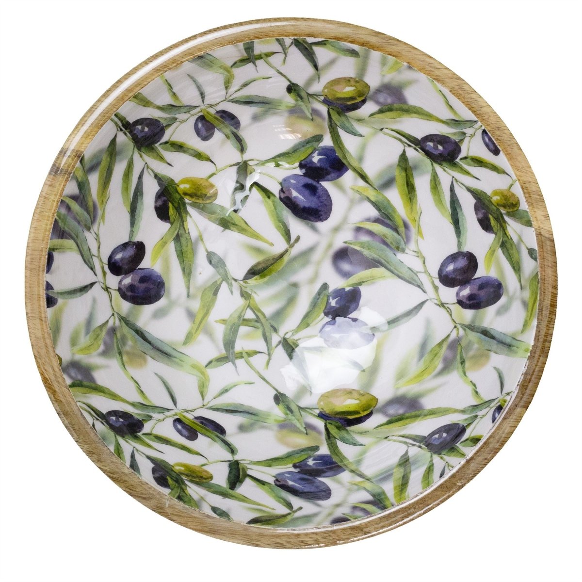 OLIVE WOODEN BOWL: Add rustic Mediterranean charm to your kitchen with this mango wood bowl, featuring a vibrant olive branch enamel design