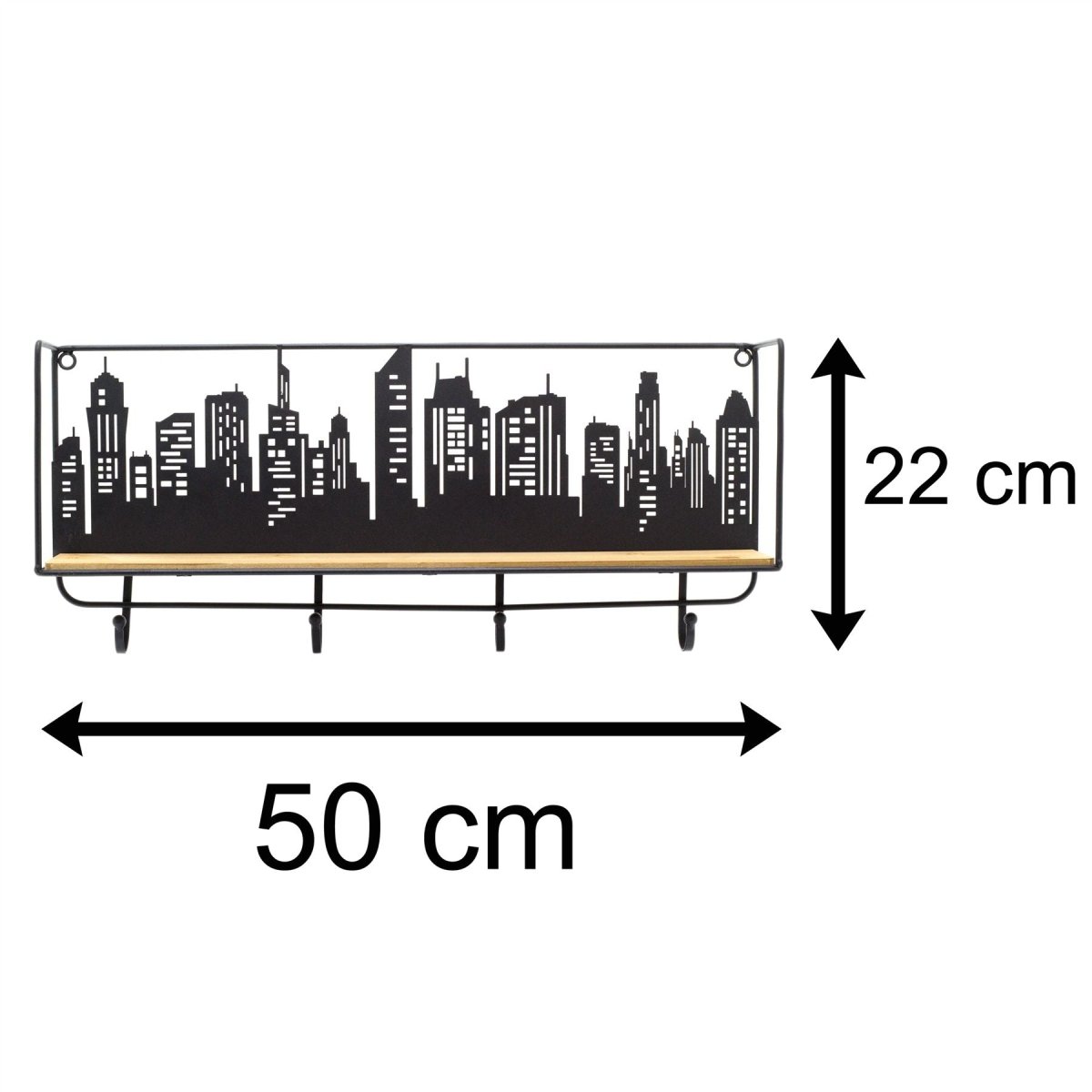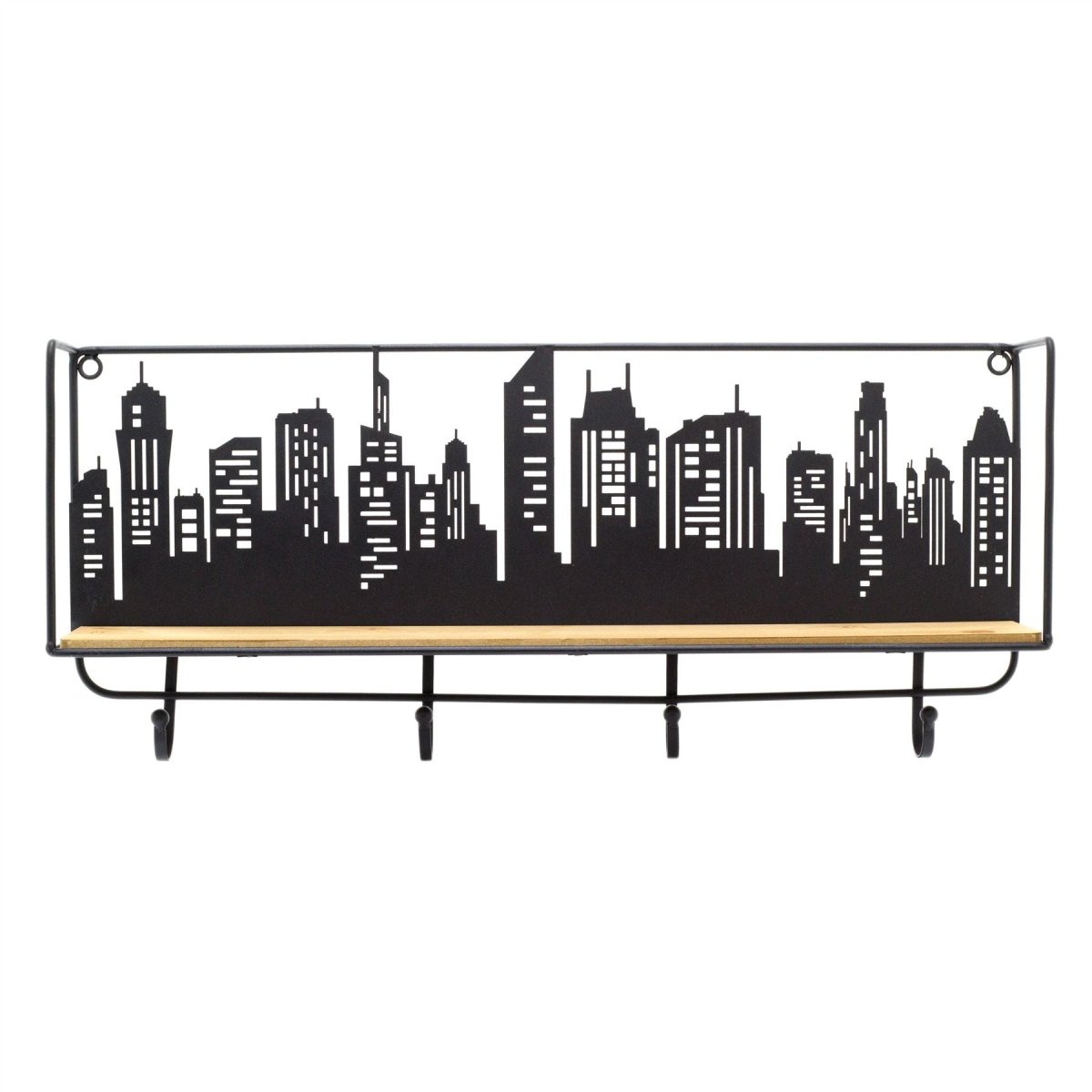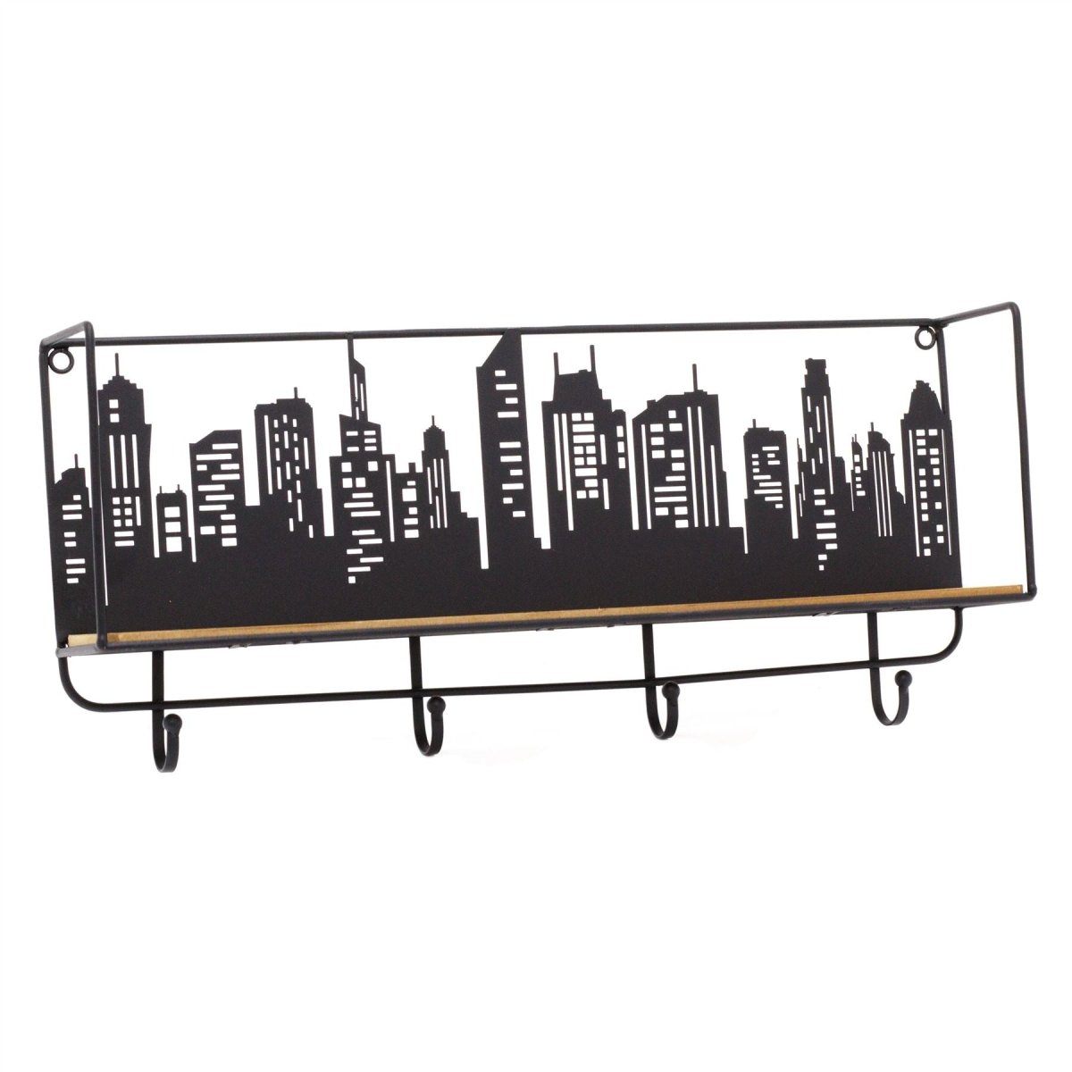 WALL SHELF: Our single shelf unit features an eye-catching urban city skyline silhouette at the rear of the shelf, with 4 handy hooks underneath