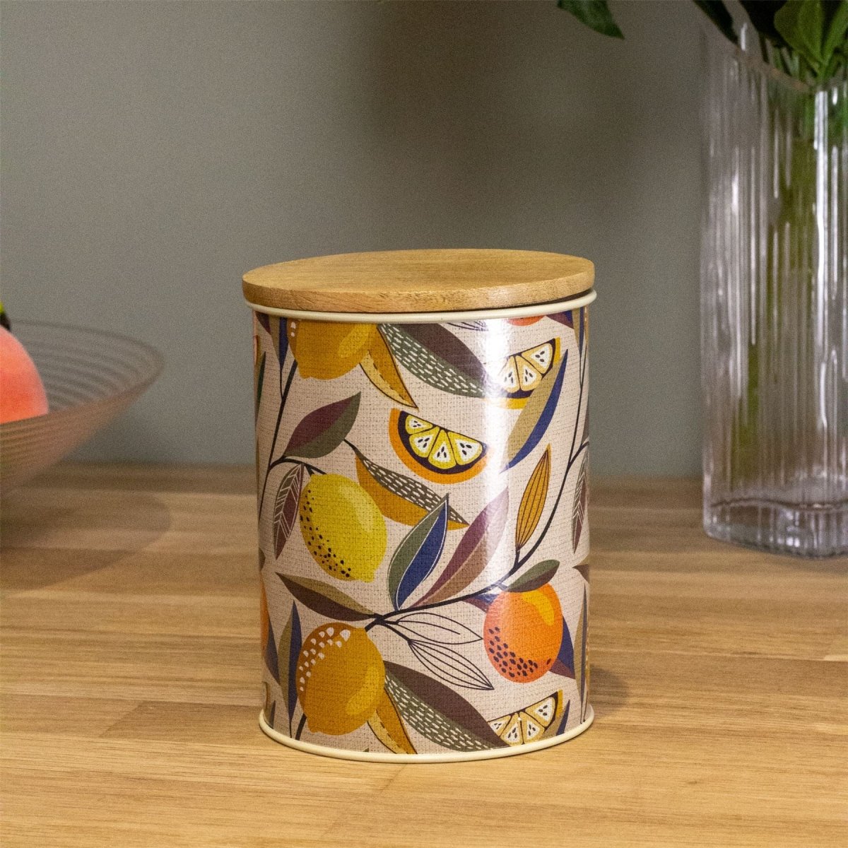 STORAGE TINS | Embrace a retro-inspired vibe with our lemon zest canister, adorned with vibrant orange and lemon motifs. The playful design adds a pop of colour to your kitchen