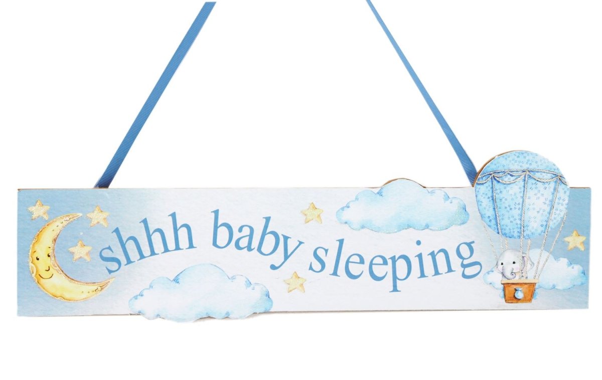 A beautifully designed door plaque featuring the wording 'shhh baby sleeping'. Great for reminding guests to be quiet. Available in a blue or pink design.