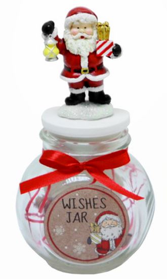 A fabulous way to let Santa know what you are wishing for. Simply write your wishes on the paper scroll and tuck inside the jar. Make sure nobody sees it though ~ for Santa's eyes only! Great for all ages to get involved. But remember, Santa will only grant your wishes if you have been good! Perfect in the run up to Christmas and makes a great Secret Santa gift. Santa stands atop the lid. Santa design may vary.
