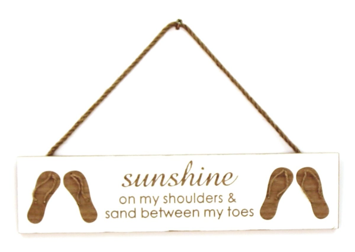 Fantastic hanging wooden sign for your home. Flip flops feature lovely natural string detailing and the plaque hangs from natural rope. Every time you look at the plaque you'll wish you were on some far flung beach - you can almost hear the waves....