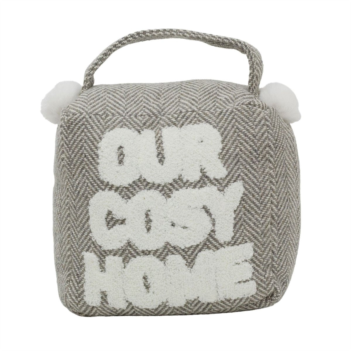 DECORATIVE DOOR STOP | Grey herringbone fabric cube door stop featuring textured 'OUR COSY HOME' quote and white pom-pom accents, adding character to any room