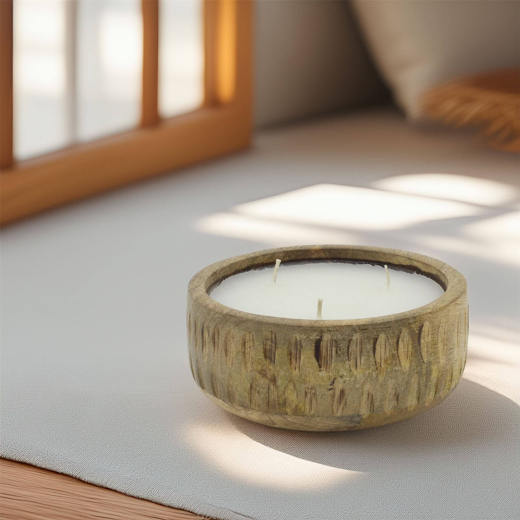 A large 3-wick white candle in a ribbed mango wood holder, scented with sandalwood and bergamot. Perfect for table centrepieces, shelves, or mantelpieces, it adds warmth and character to any room