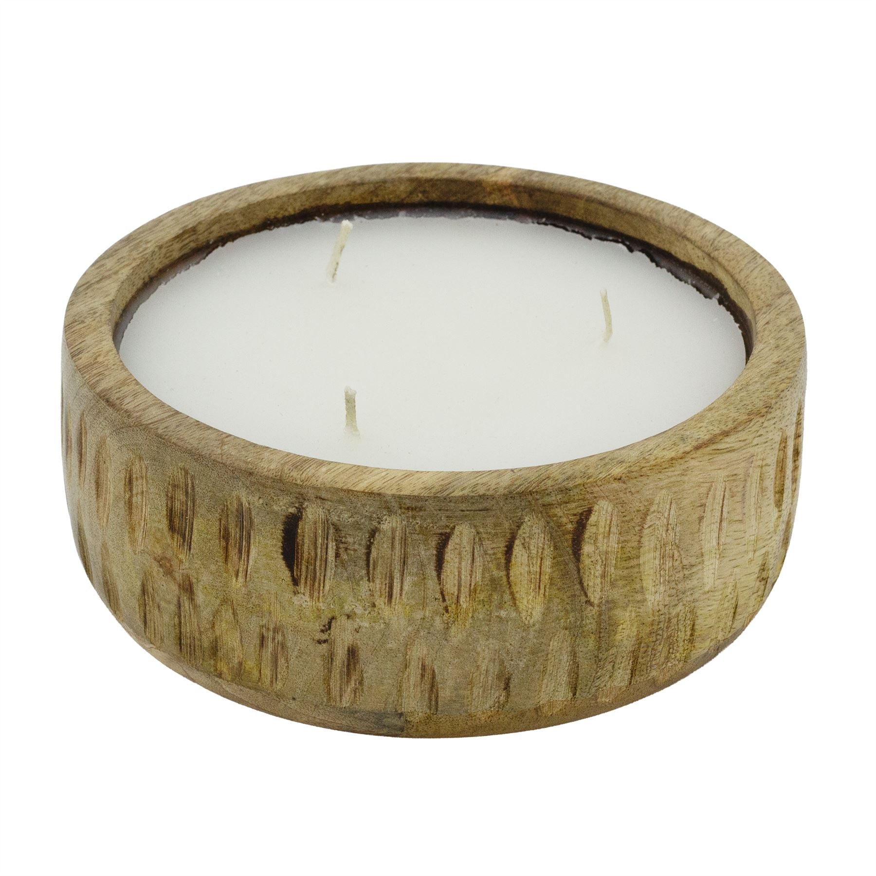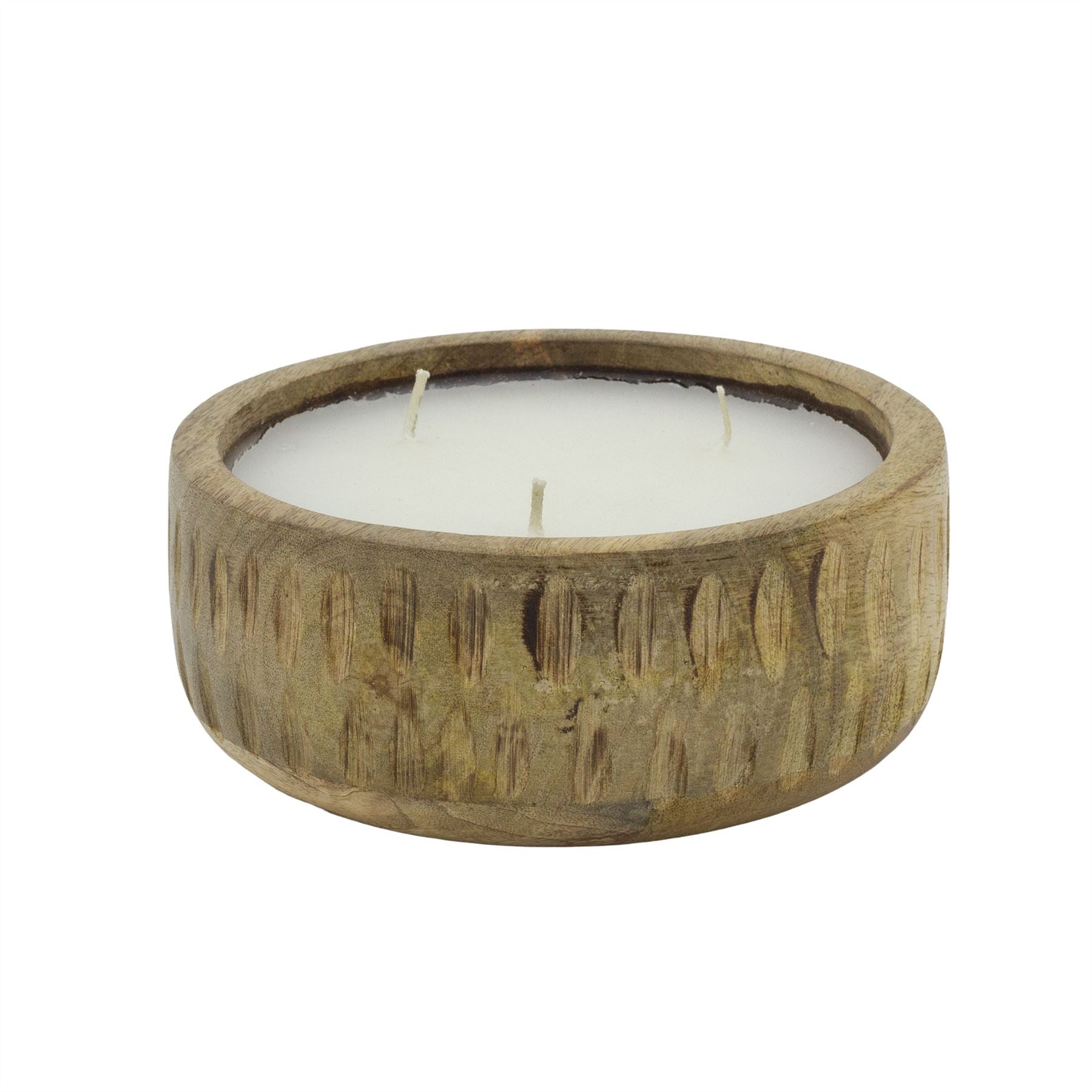 TRIPLE WICK CANDLE | A generous white wax candle with three wicks, set in a ribbed mango wood holder for natural texture and classic appeal