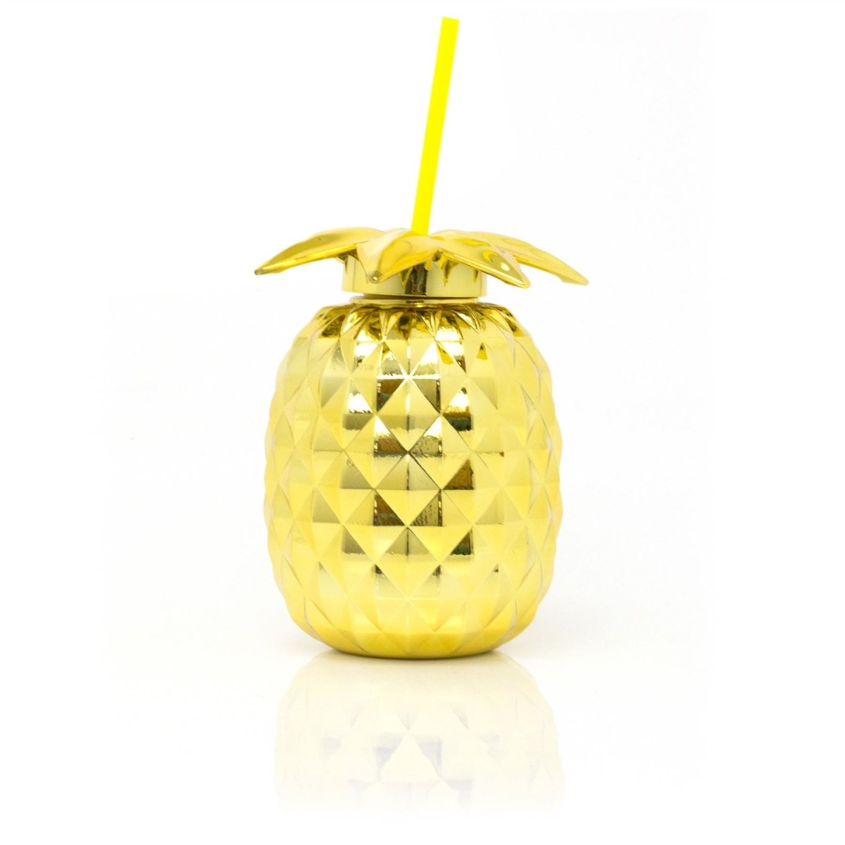 PINEAPPLE CUP: This gorgeous pineapple tumbler features a screw top lid with integral reusable straw, and comes in an eye-catching metallic gold finish. Suitable for children and adults alike
